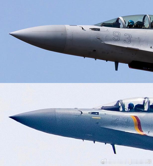 歼-15D和歼15DT电战机雷达罩对比,可以看到后者除了改弹射之外,在电子设备上也改进不少。此外歼-15DT还取消了翼刀。
