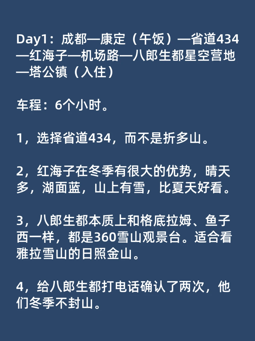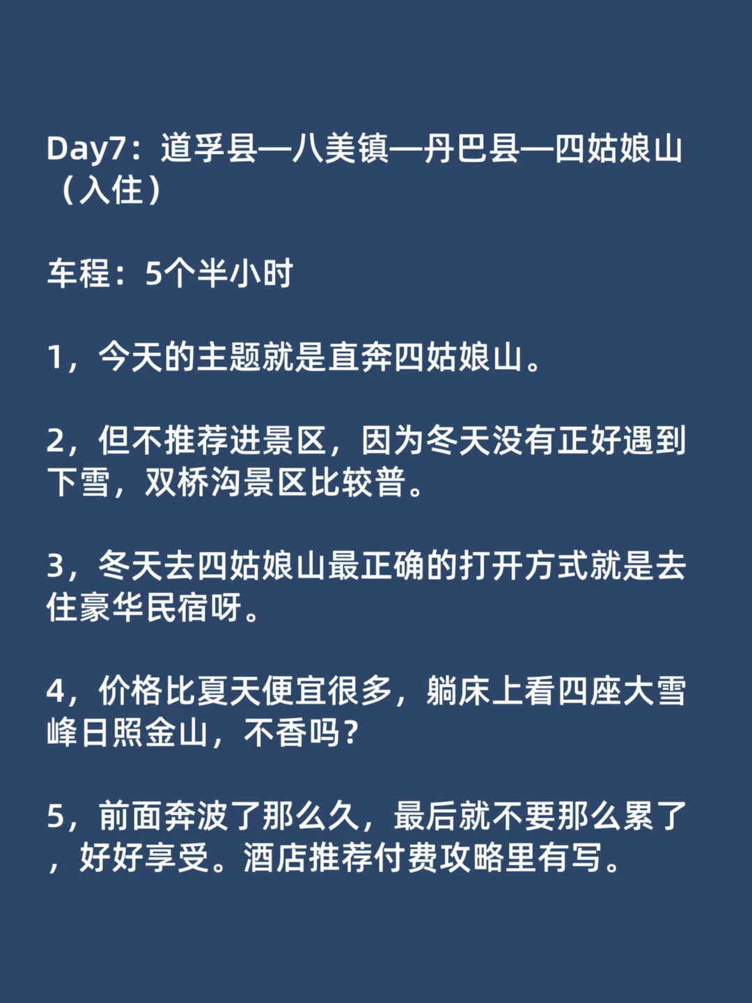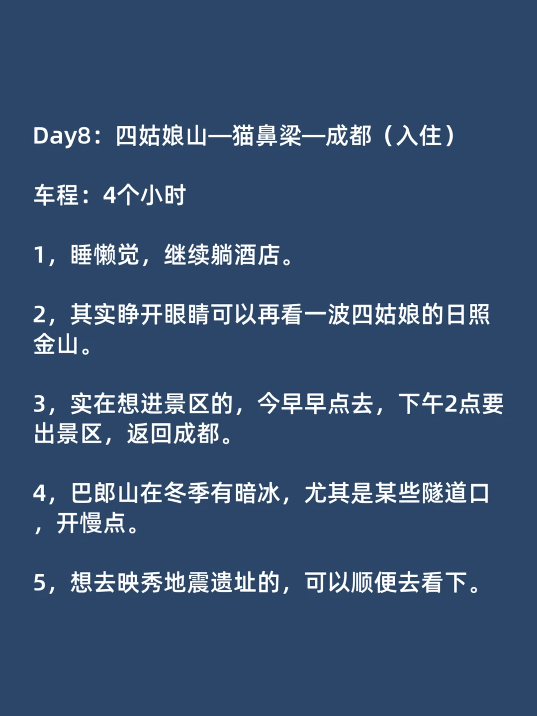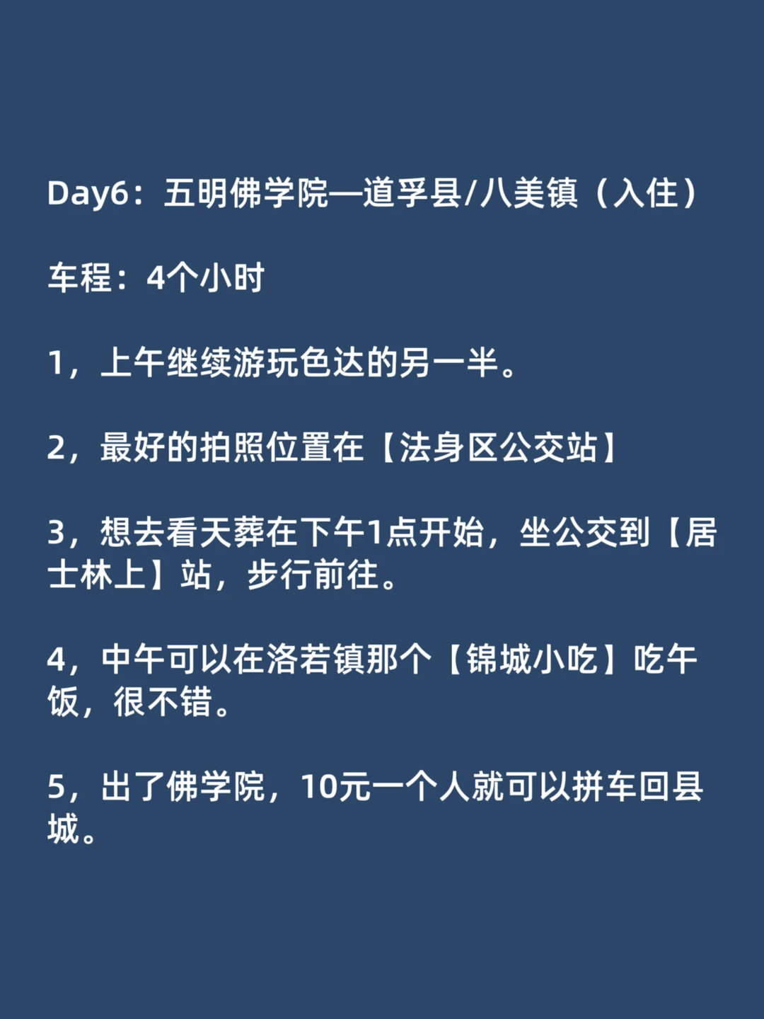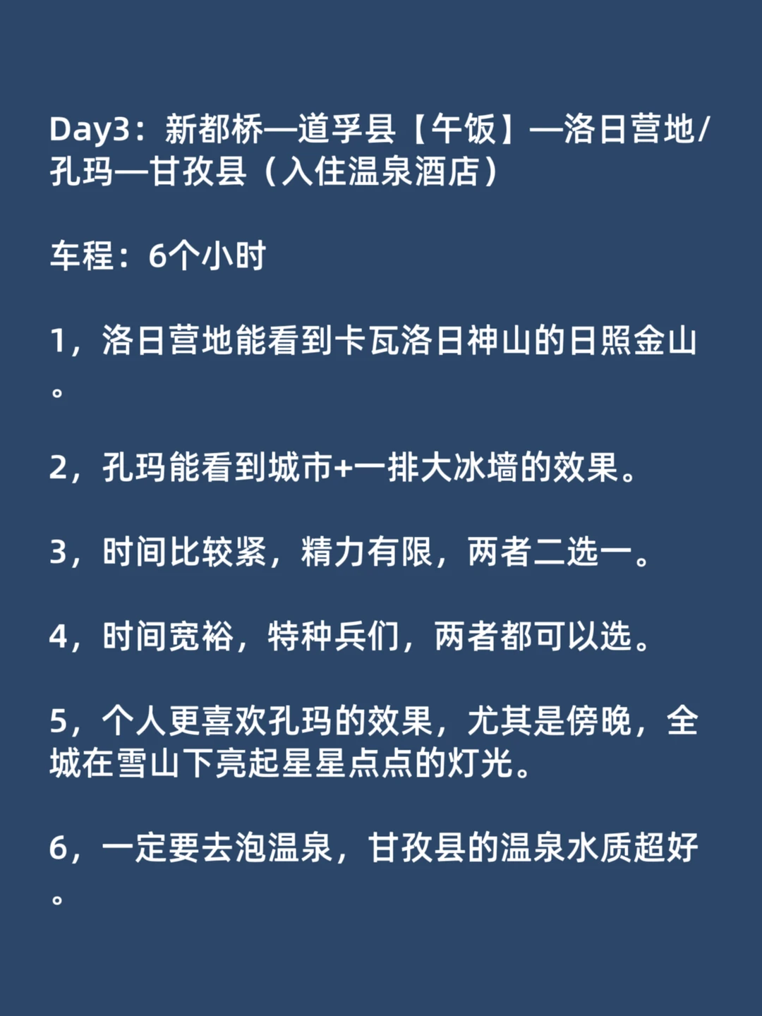 10,如果时间不够8天,该如何删减?一,删除day2,不去甲根坝看贡嘎,从day2直接导航去甘孜县,如此就变成7天了。二,删除day5,不去色达,直接从甘孜县去道孚县/八美镇,如此也能变成7天。三,删除day7,不去四姑娘山,直接从道孚县/八美镇驱车返回成都,再次变成7天。如果你只有6天,就在这三者里面,三选二进行删除。不建议都删了,这个行程至少要6—8天才合理,5天就会变得很奇怪。