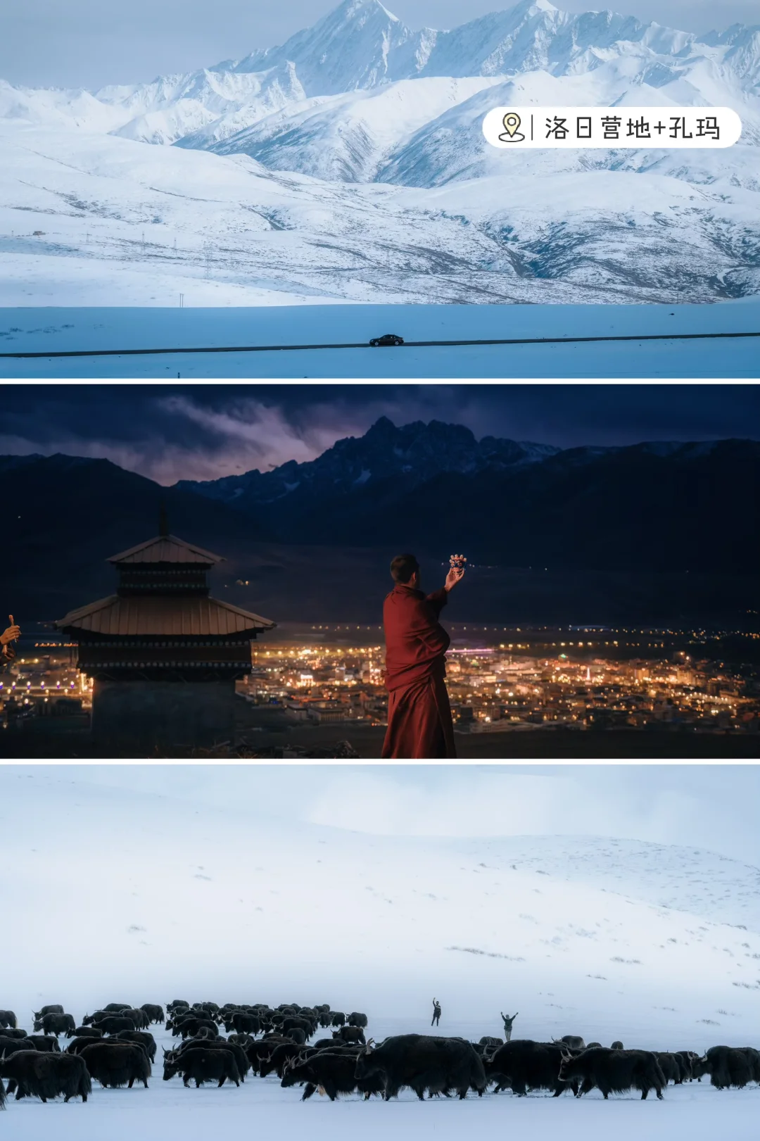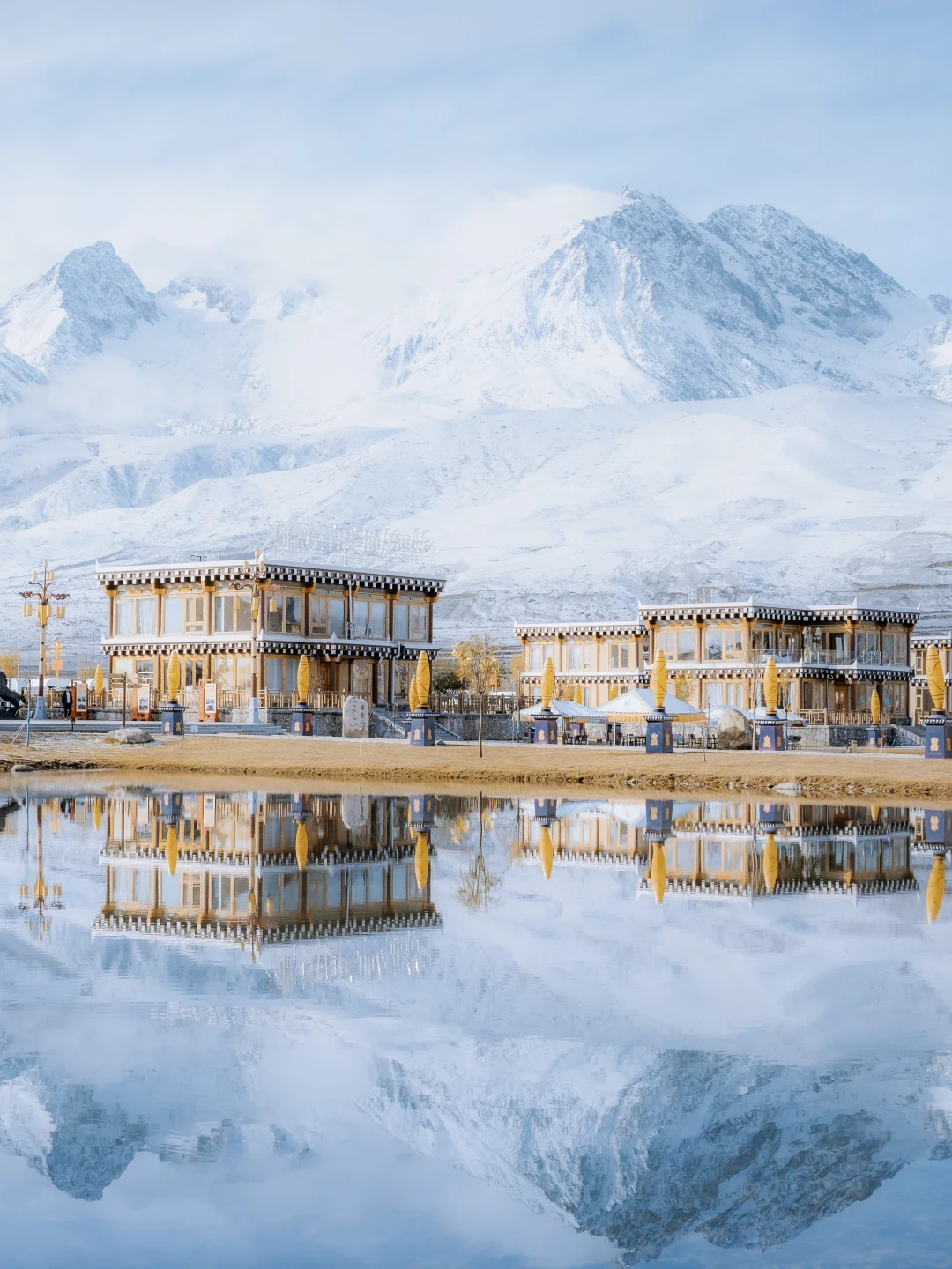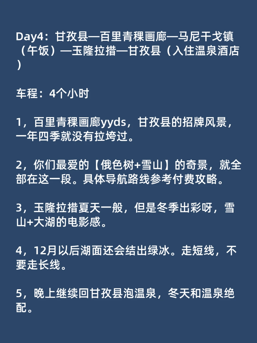 4,然后会着重去到【甘孜县】。甘孜县不封山,百里青稞画廊的雪山景观太丰富,景色类别又和前两者有很大的不同。还可以去看下新路海的冬季纯净湖水、绿冰。县城也有许多天然的硫磺温泉,冬季泡温泉的执念,不是只有我吧吧吧?