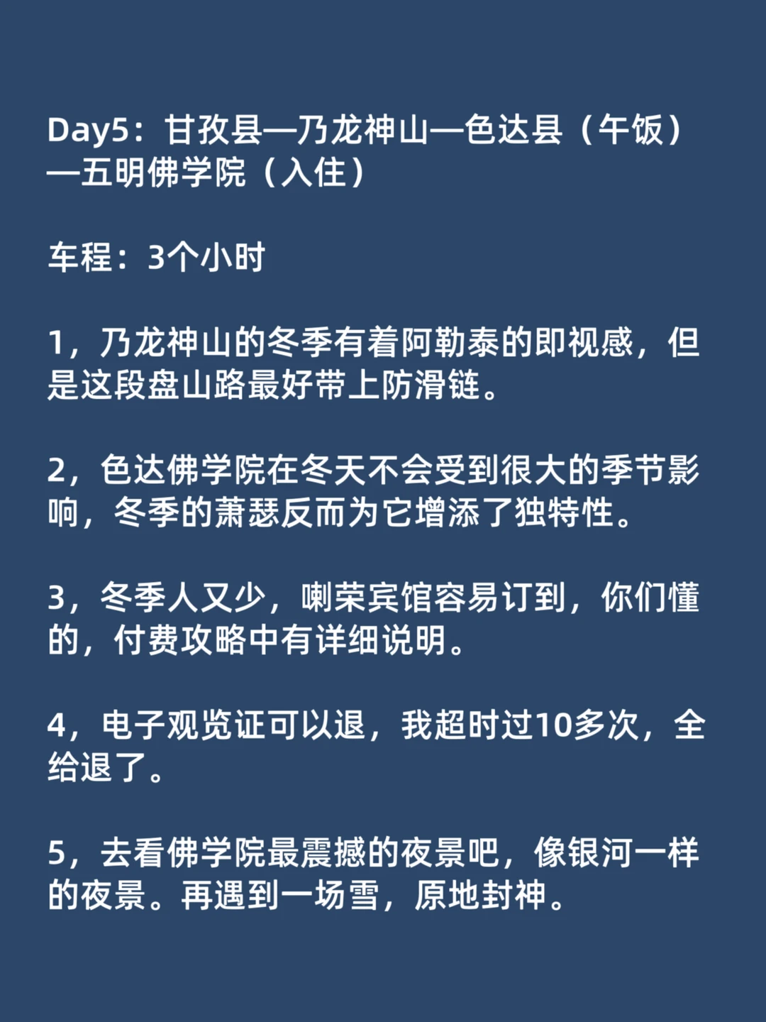 5,接着路线中也有色达。不想夏天人从众,冬天的色达是一个好的选择。日照金山再好看,连续看几天也会腻,色达的加入,会让路线体验丰富起来。雪山、湖泊、人文,酒店休闲,这样松弛有度,也没有审美疲劳。
