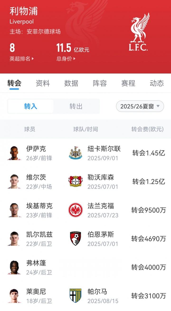 今年夏天利物浦花费了4.829亿欧引援,维尔茨和伊萨克先后成为标王,上赛季末又顶薪续约了萨拉赫和范戴克,如此大手笔让球迷都以为利物浦能延续上赛季的强势表现。