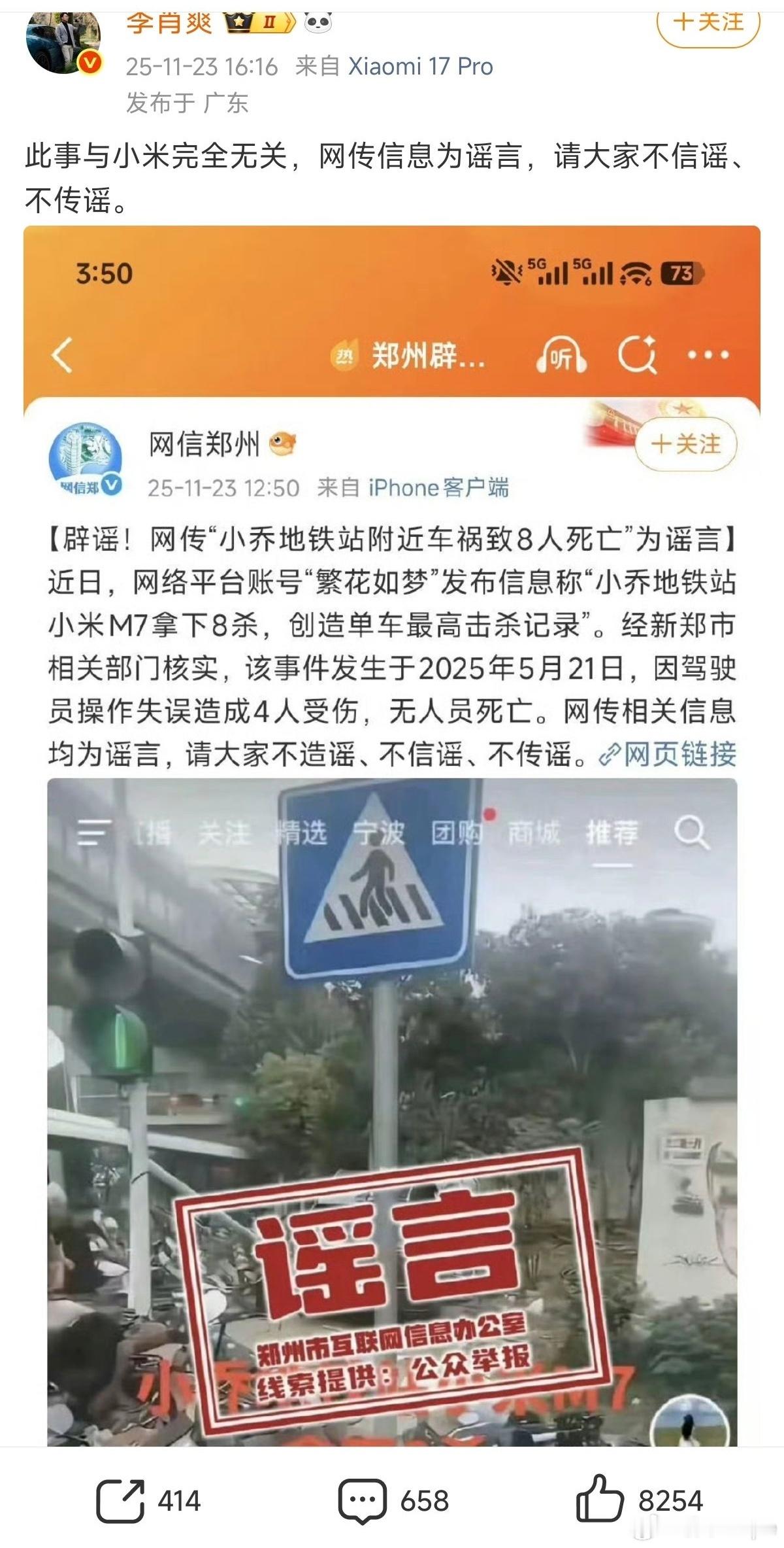 重庆网警辟谣|别再断章取义传谣言啦✨咱先把话捋明白,别跟风乱传混淆视听~重庆网警都查实处罚造谣者了,小米辟谣的核心很明确:压根没有所谓“八杀”的死亡情况,更不存在小米M7关联致死的说法所谓“4伤”是早前驾驶员操作失误导致的真实事故,但被别有用心之人恶意拼接图文、夸大造谣,硬生生编出“最高击杀记录”的离谱谣言🤷♀️网络不是法外之地,传消息前多核实权威渠道,别被流量推手带偏节奏清朗网络空间,咱都少添点乱~🙅♂️重庆网警小米高管辟谣M7系列撞人小米辟谣理性看待网络传言新能源汽车小米汽车大v聊车社会热点汽车