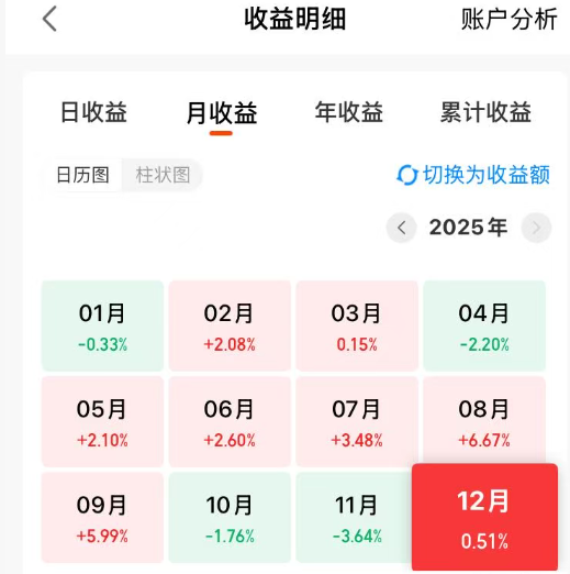 基少的基金主账户,12月份上涨0.51%,小幅回暖,主要是有色、混合基金和美股基金提供了正收益。