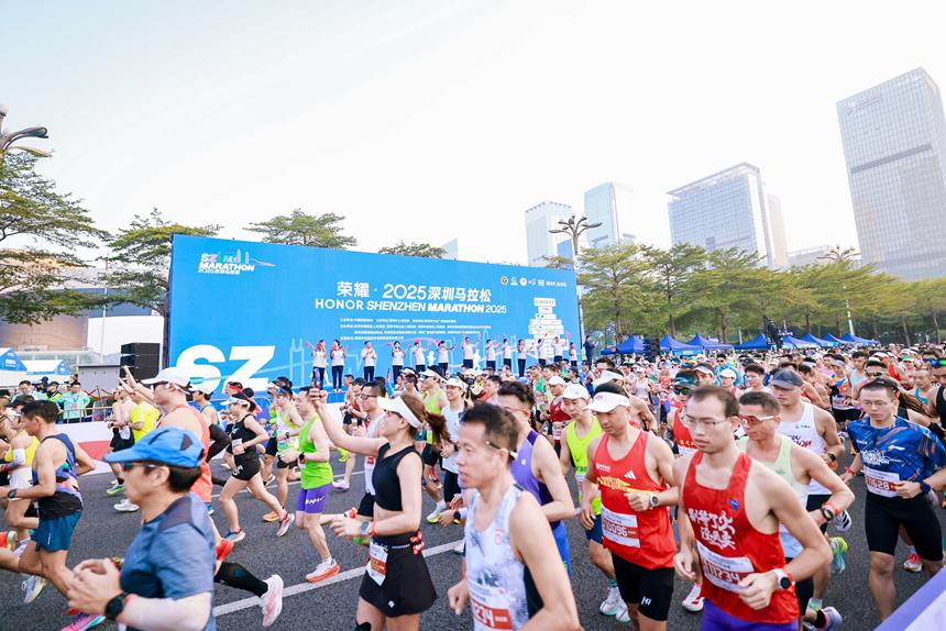 荣耀·2025深圳马拉松在深圳市民中心鸣枪开跑。主办方供图