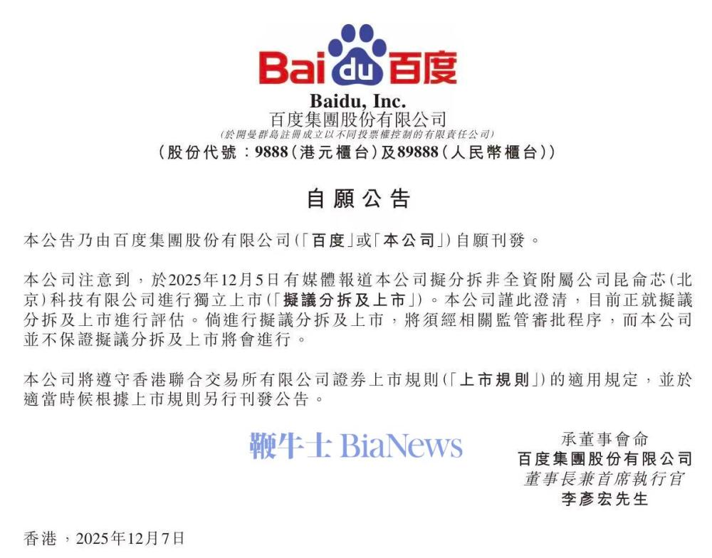 12月7日,百度发布公告确认正评估分拆昆仑芯独立上市,但尚未作出最终决定,后续需通过相关监管审批,不保证事项必然推进,将按港交所规则及时披露进展。