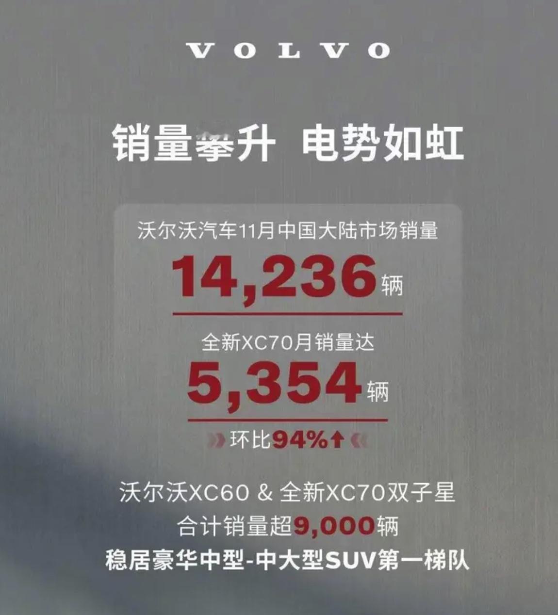2025 年 11 月,沃尔沃汽车在中国大陆市场销量达 14236 辆,1 - 11 月累计销量 133103 辆。全新 XC70 11 月销量 5354 辆,环比增长 94%,成为沃尔沃品牌销售冠军车型,自 9 月 26 日上市累计销量 9211 辆。 - **沃尔沃销量数据**:2025 年 11 月,沃尔沃汽车在中国大陆市场售出 14236 辆,1 - 11 月累计销量达到 133103 辆。 - **全新 XC70 销量**:全新 XC70 在 11 月销量达到 5354 辆,环比增长 94%,成为沃尔沃品牌销售冠军车型。自 9 月 26 日上市以来,累计销量已达 9211 辆。【来自懂车帝车友圈】