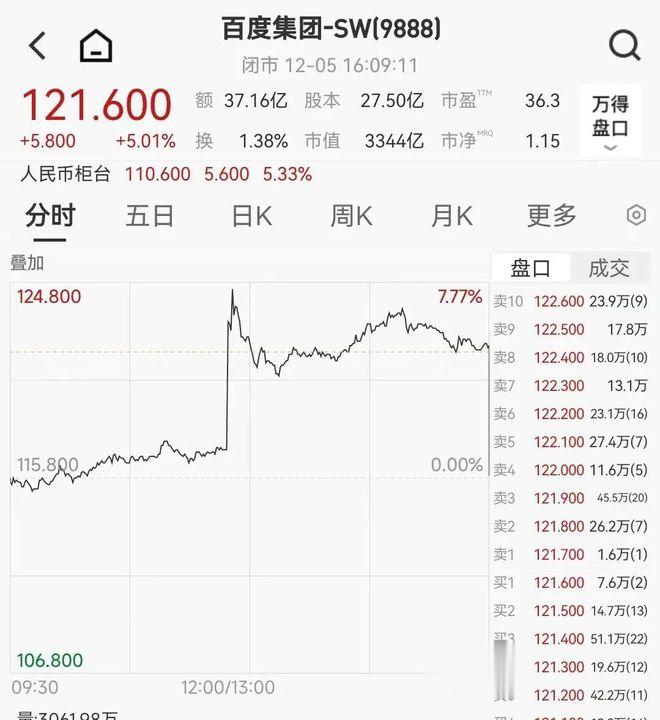 截至12月5日,百度港股午后突然直线拉涨,一度涨近8%。随后涨幅收窄,截至收盘涨超5%,报121.6港元/股,总市值为3344亿港元。