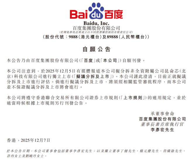 12月7日晚间,百度集团港股公告,公司注意到于2025年12月5日有媒体报道公司拟分拆非全资附属公司昆仑芯(北京)科技有限公司进行独立上市。
