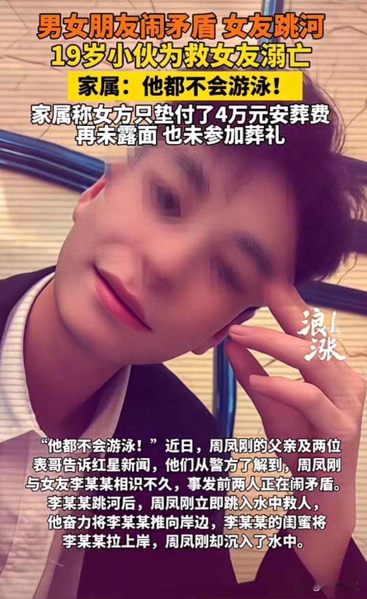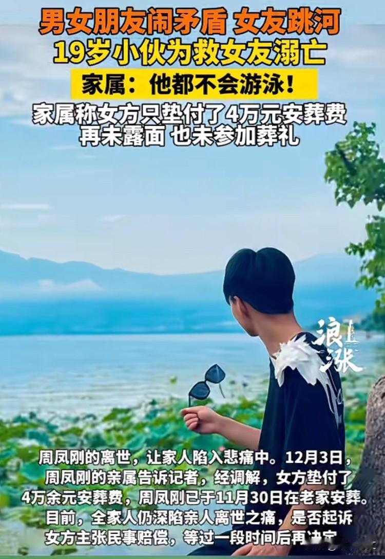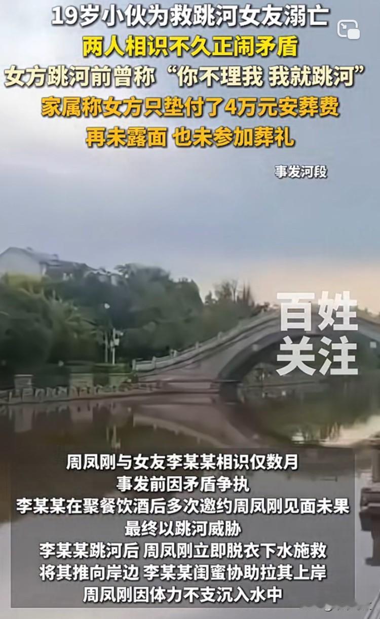 悲剧还是发生了!四川西昌,男子跟女友闹矛盾,争执过后,女友一气之下跳入冰冷的河水中。不会游泳的男子也毫不犹豫的跟着跳下去。最终一命换一命,而女友的态度令无数人心寒! (来源:百姓关注) 四川西昌,11月21日凌晨,19岁的周凤刚接到女友的电话,邀约他外出喝酒。但就在几天前,这对小情侣才闹完矛盾。所以周凤刚拒绝了女友的邀约。 但女友没有放弃,一而再再而三的给他打电话。甚至威胁周凤刚:“你不理我,我就跳河!” 此话一出,周凤刚慌了神,也许只是女友的气话,但他还是选择赴约。可没想到,这场凌晨的见面,成了他们最后的一面。 聚完餐后,这对小情侣并未和好。两人走在河边,女友一时情绪激动纵身跳入冰冷的河水中。 那一刻,周凤刚没有丝毫犹豫,迅速脱下外衣跳进河里。甚至都忘记自己并不会游泳。他拼尽全力将女友推向岸边。女友的闺蜜及时赶到现场协助将其拉上岸。 而周凤刚因为体力不支渐渐沉入水中,冰冷的河水一寸寸漫过他的口鼻,裹住他的身体。这个年仅19岁的男孩永远的留在了这个寒夜里。 心酸的是,家人得知此噩耗时才得知儿子有女友,而他们相识仅数月。这段短暂的感情却以一场葬礼收场。 周凤刚已于11月30日在老家安葬,全家深陷在亲人离世之痛中。年迈的父母更是不愿面对这一事实。 而女友的态度更令人心寒,她垫付了4万元的安葬费后便销声匿迹,连周凤刚的葬礼都未曾露面。 这不是一场可歌可泣的爱情壮举,而是一场悲剧。女友以死相逼,用这种极端方式绑架对方。这既是一场豪赌也是在轻贱自己和他人的生命。 周凤刚毫不犹豫地下水救助,既是本能的善意也是出于责任,因为他觉得女友是因为自己才跳河,他做不到袖手旁观。但年轻人还是太冲动太莽撞了,这是对自己和家人的不负责。 律师说,男女朋友在法律上无明确救助义务。但受益人应给予补偿。可在法律边界之外,女友也背上了沉重的道德枷锁。因为她的一时生气的举动而吞噬了一个生命。 在爱情中,大家常说要爱得轰轰烈烈,要奋不顾身。但真正的爱应该是学会好好沟通,理性处理矛盾,没有任何事情值得用生命去证明。珍惜生命!