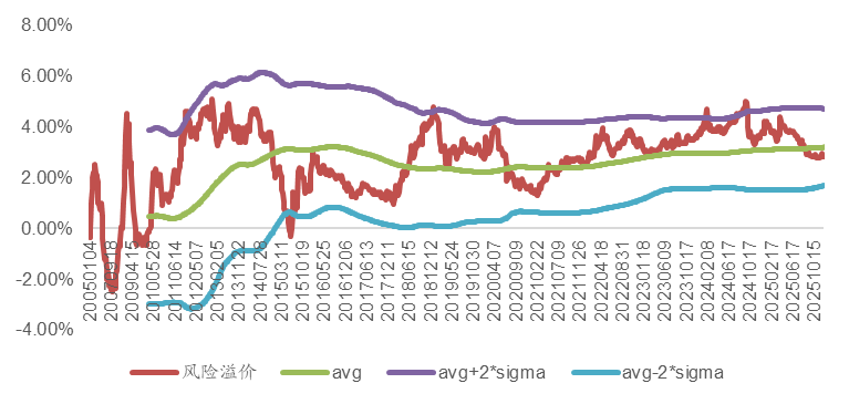 风险溢价,中证全指静态PE的倒数EP减去十年期国债收益率,权益与债券资产隐含收益率对比,截至2025/12/5指标2.81%,两倍标准差边界为4.72%。