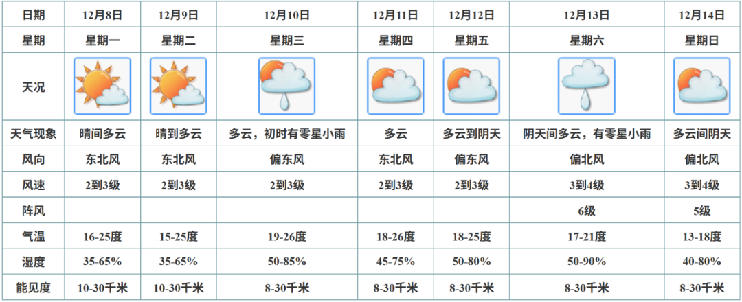 预计,8日至9日持续晴朗干燥,早晚较凉;10日至12日云量增多;13日至14日受新一股冷空气影响,北风加大,气温下降,并伴有零星小雨。