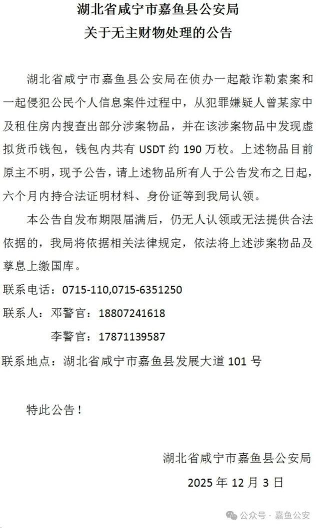 湖北省咸宁市嘉鱼县公安局在侦办一起敲诈勒索案和起侵犯公民个人信息案件过程中,从犯罪嫌疑人曾某家中及租住房内搜查出部分涉案物品,并在该涉案物品中发现虚拟货币钱包,钱包内共有USDT约190万枚。上述物品目前原主不明,现予公告,请上述物品所有人于公告发布之日起六个月内持合法证明材料、身份证等到我局认领。本公告自发布期限届满后,仍无人认领或无法提供合法依据的,我局将依据相关法律规定,依法将上述涉案物品及孳息上缴国库。