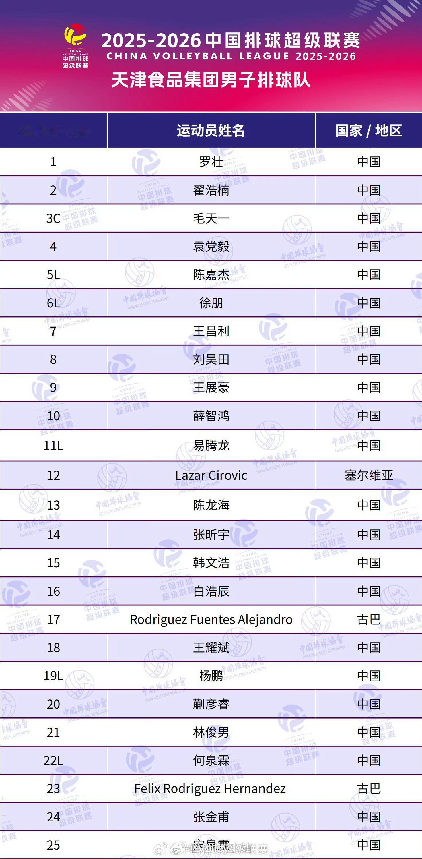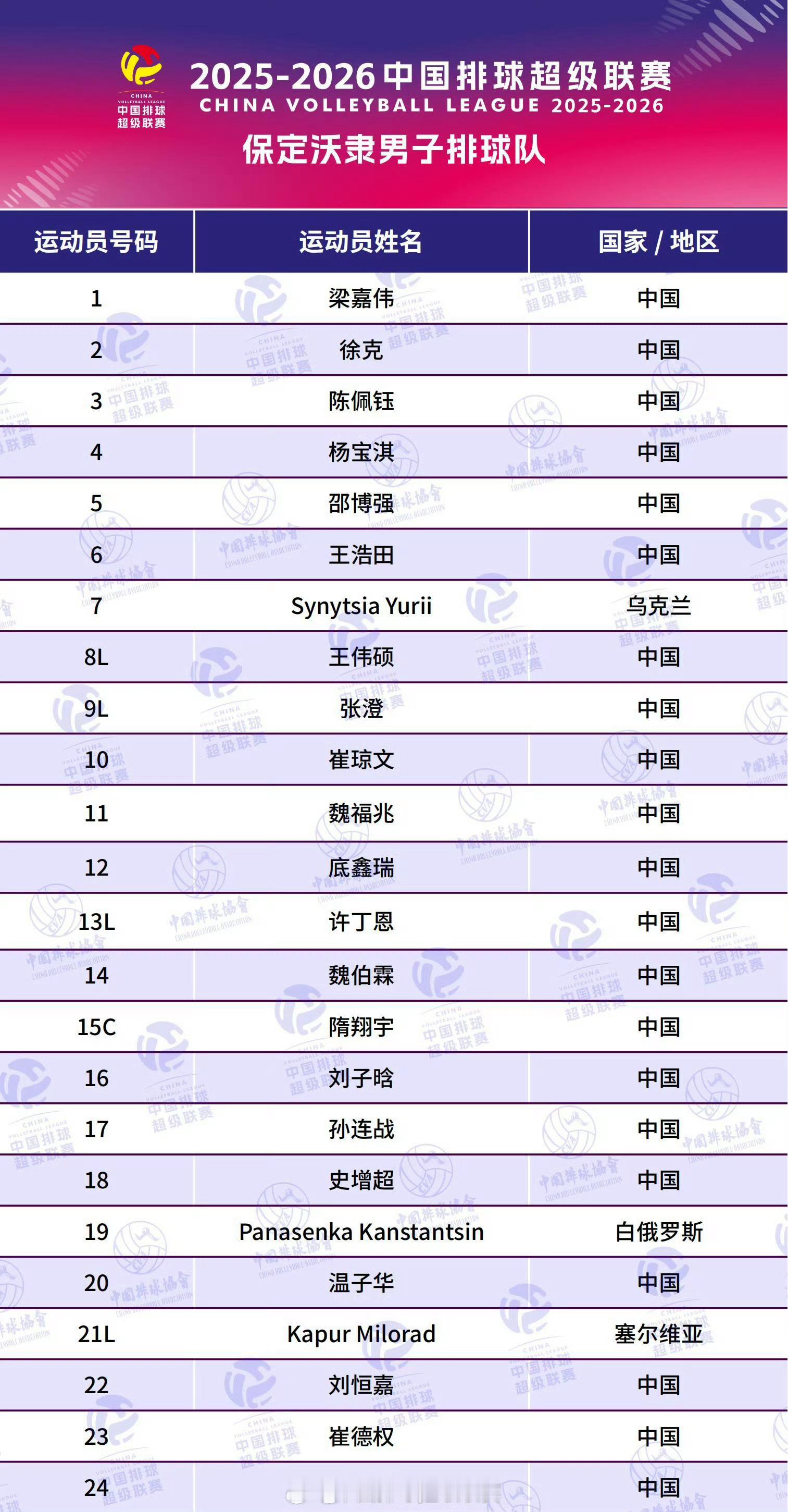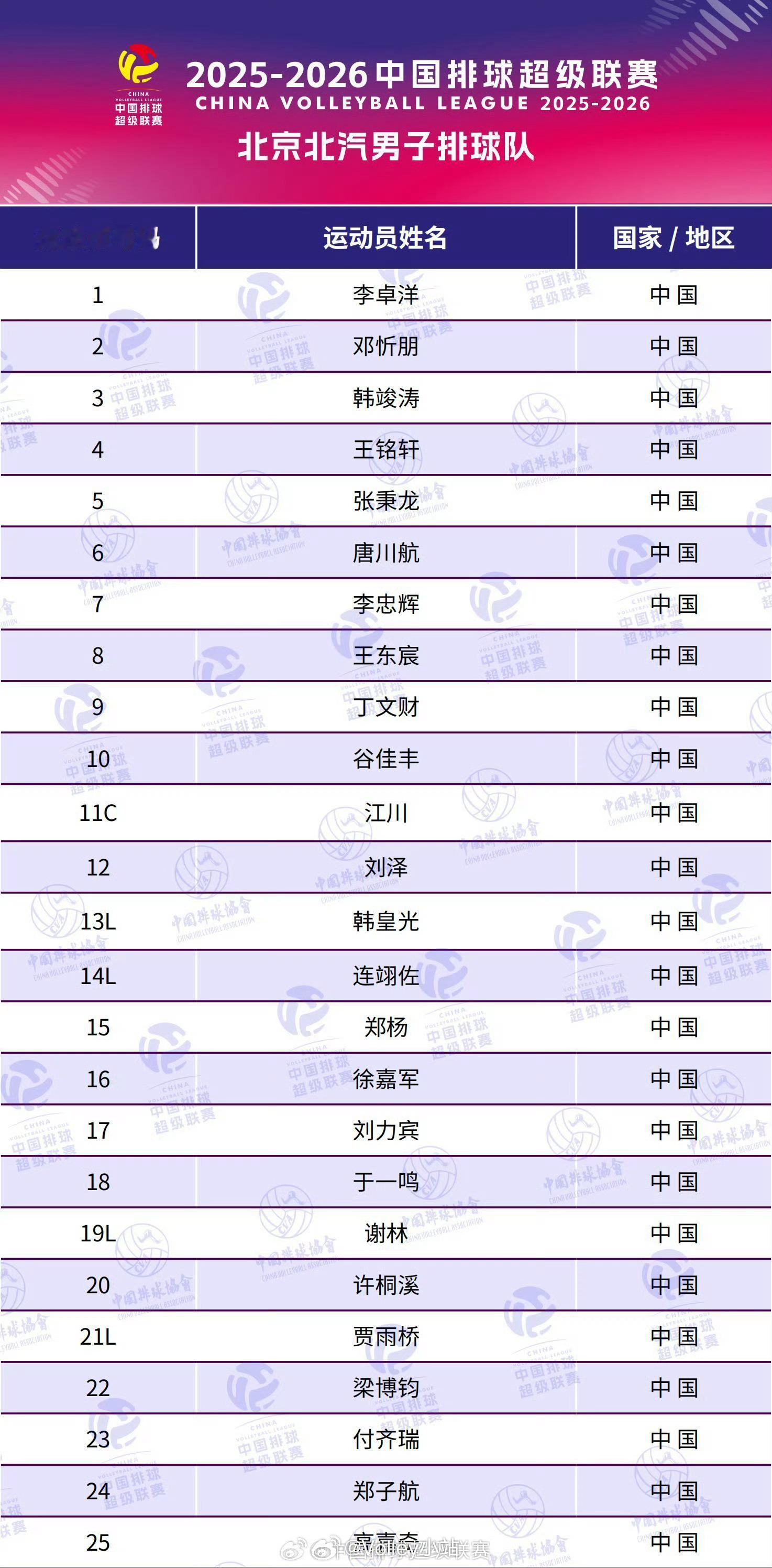 2025-2026中国男排超级联赛A级8支队伍大名单排超联赛2025-2026中国排球超级联赛