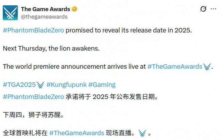 终于等来了!国产单机游戏《影之刃零》官宣!灵游坊官方今天在 X 平台发文,称《影之刃零》的发售时间已经定好。将在TGA现场公布发布时间。影之刃零黑神话独立游戏