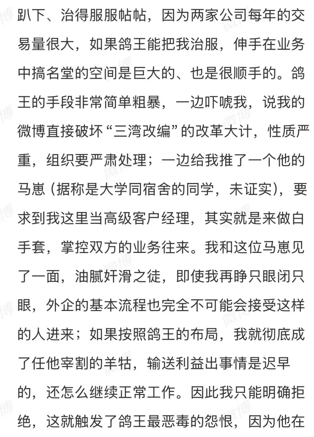 据该帖子叙述,彼时于泽一方面说陈东辉的帖子直接破坏了人保财险的“三湾改编”改革大计,性质严重组织要严肃处理。另一厢则要在他所在的公司塞进一个据称是他的大学同学的人当高级客户经理。