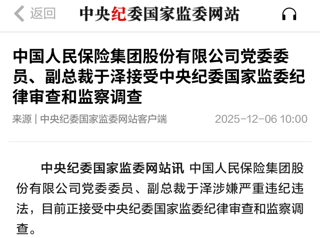 公告披露,12月6日,中国人民保险集团股份有限公司(下称“中国人保”,601319.SH,1339.HK)党委委员、副总裁于泽涉嫌严重违纪违法,目前正接受中央纪委国家监委纪律审查和监察调查。