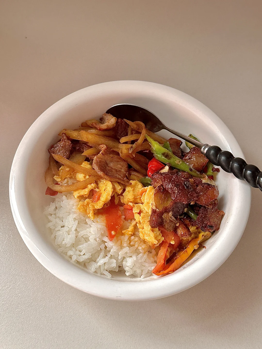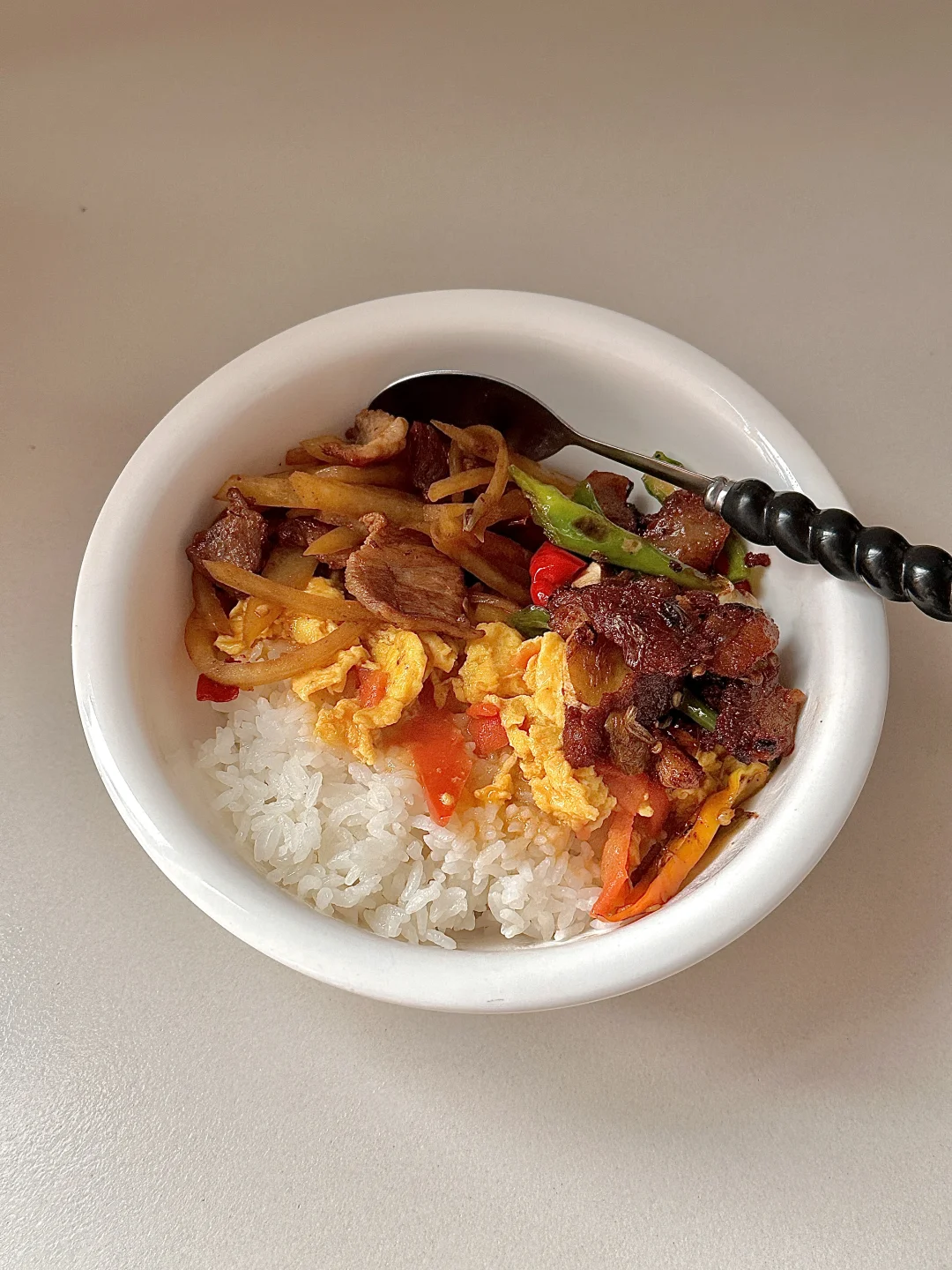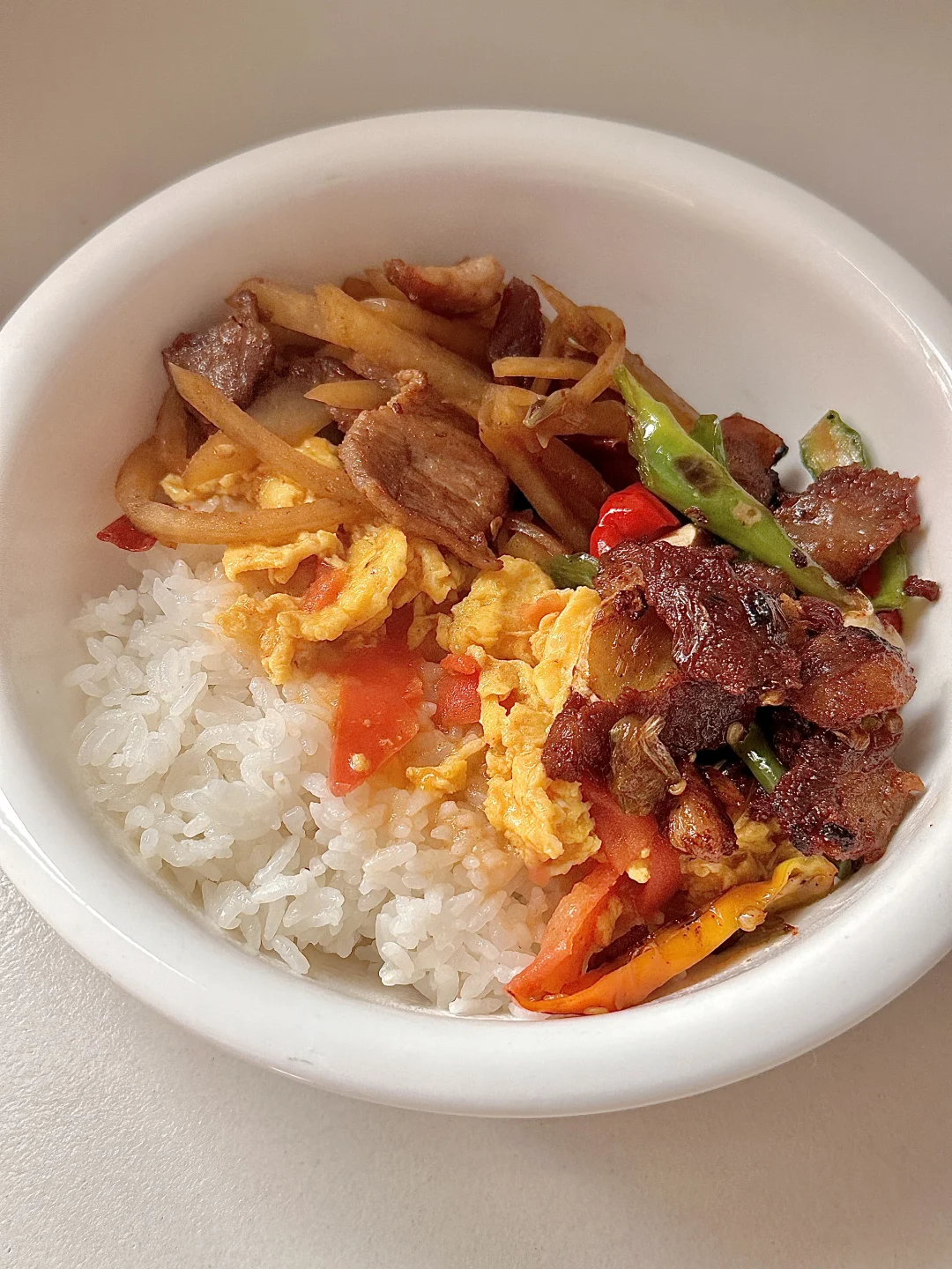 今天吃 肉炒土豆丝,番茄炒蛋,辣椒炒肉! 家常菜就是zui好吃的减脂餐了,中国胃就是离不开大米饭🍚🥢,酸酸的番茄炒蛋汤汁浇饭,再来点香香辣辣的辣椒炒肉🥩简直太下饭啦!