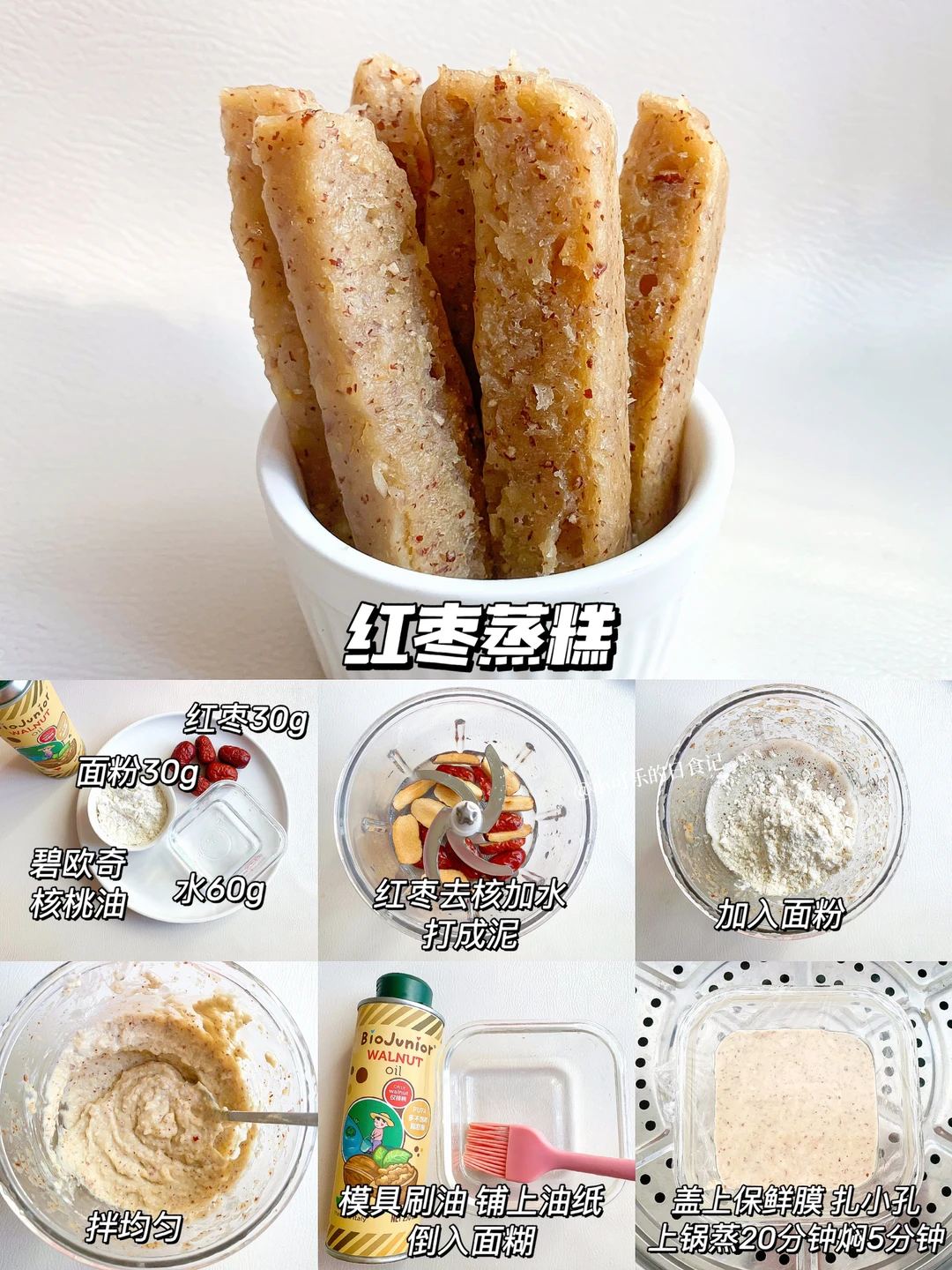 🛒食材:红枣4个、苹果100克、面粉45克、水10毫升、碧欧奇核桃油