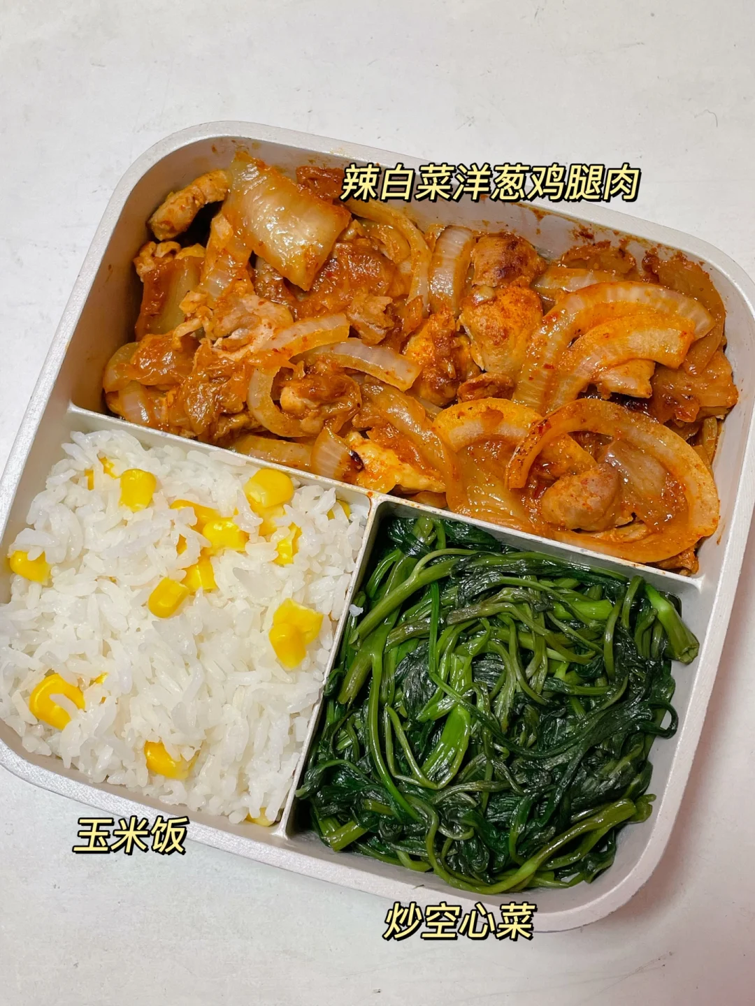 📍玉米饭+辣白菜洋葱炒鸡腿丁+炒空心菜