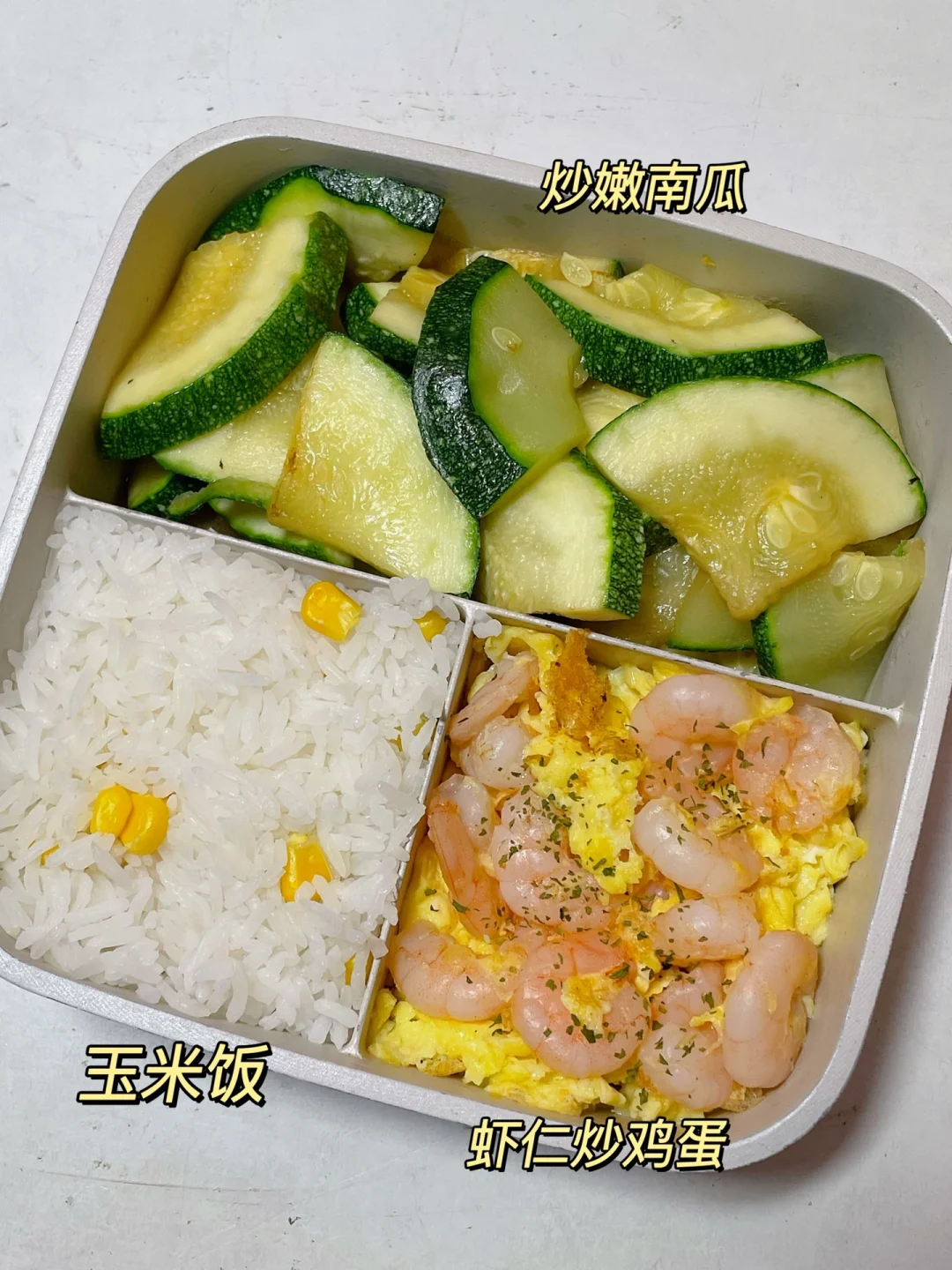📍玉米饭+虾仁炒鸡蛋+炒嫩南瓜