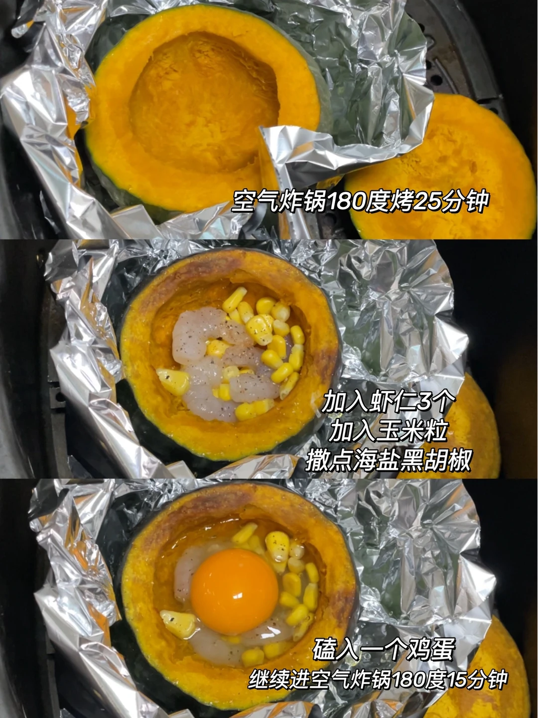 1️⃣贝贝南瓜开盖去瓤,进空气炸锅180度烤25分钟