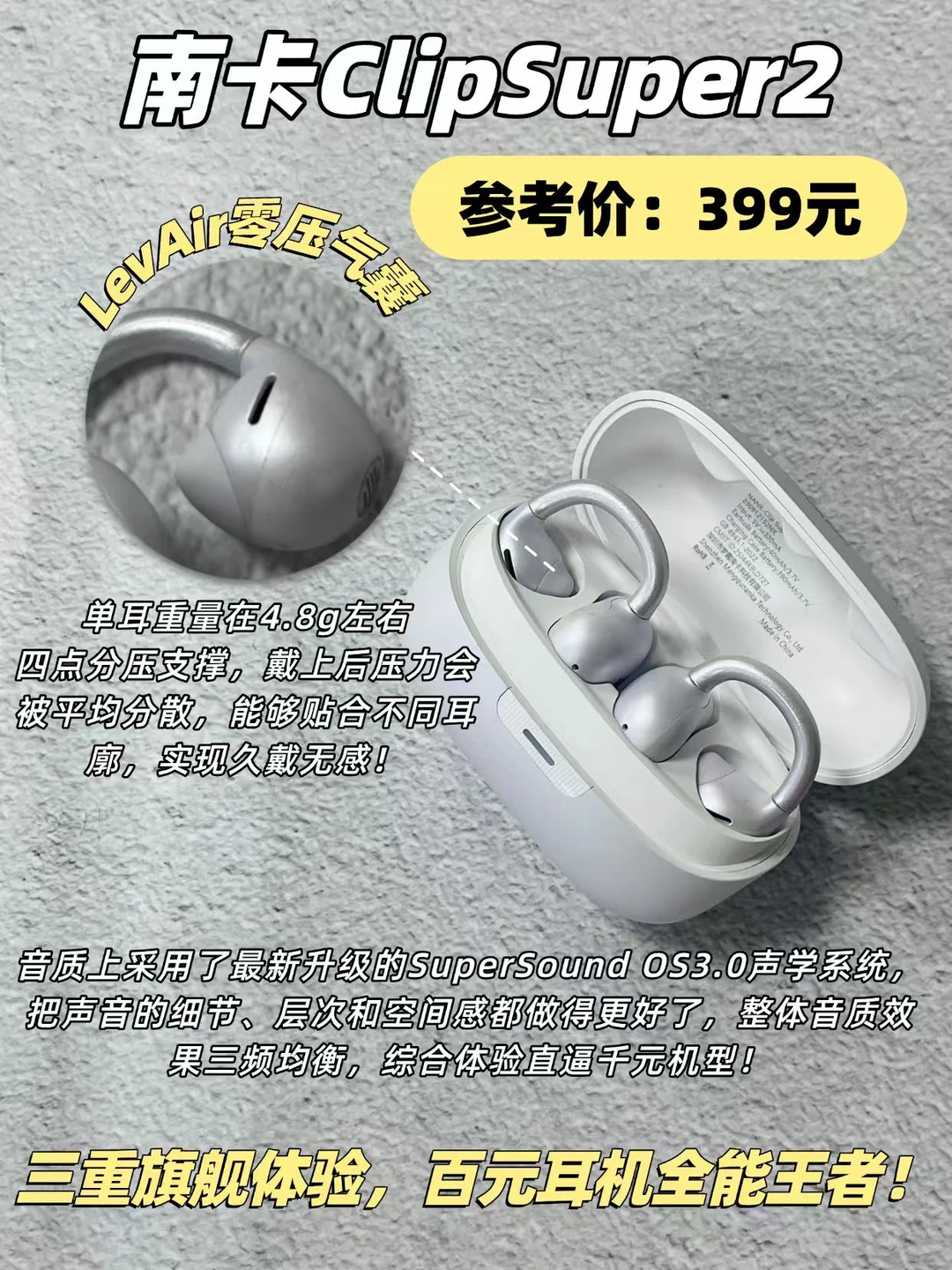 如果你追求全天舒适佩戴+三音均衡的音质+低漏音,南卡 ClipSuper2 是很不错的选择;