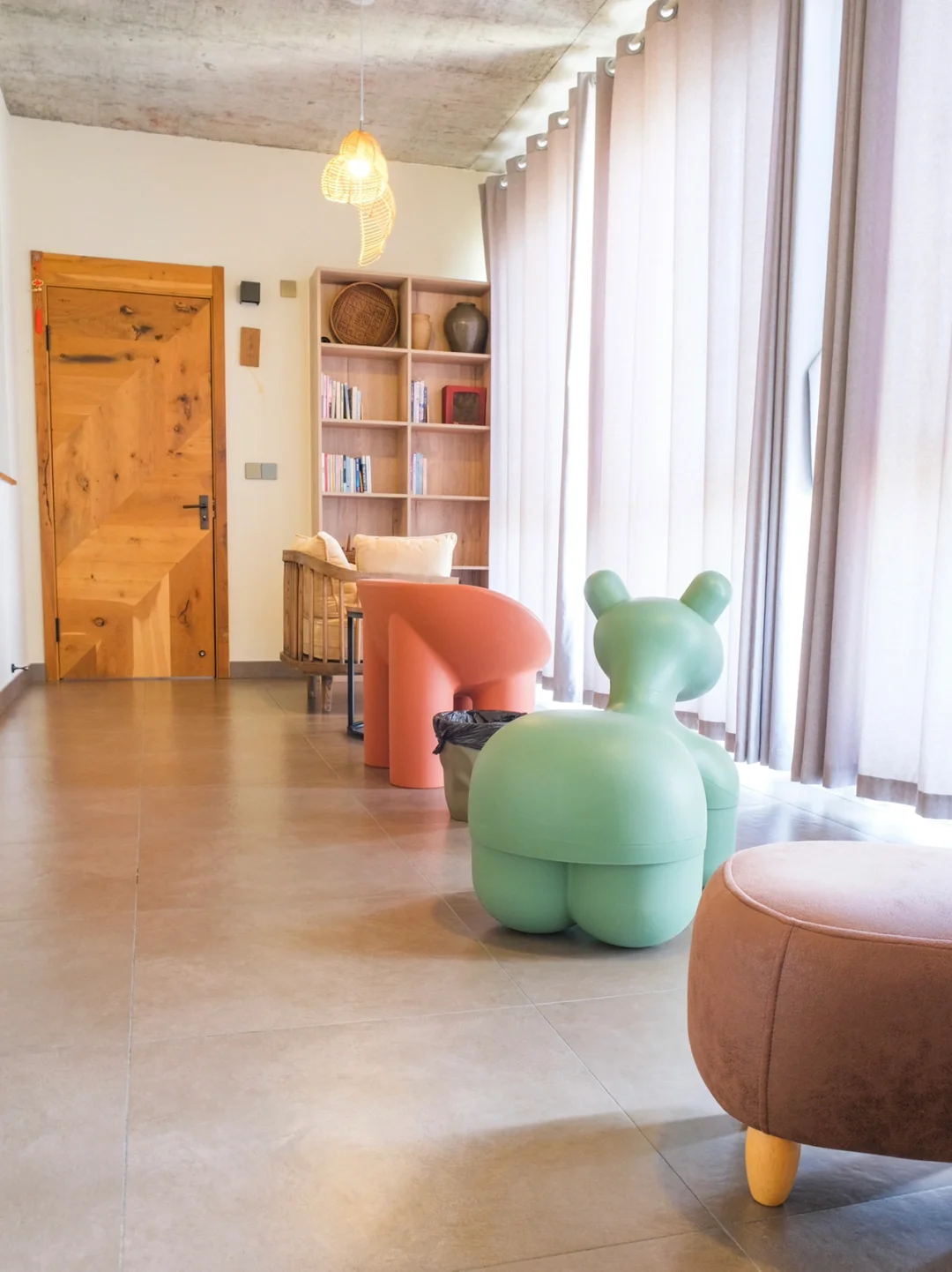 1⃣️4层楼9种房型,每层楼都有茶室;全景落地窗走廊,布置了休闲椅和书吧📖,视野开阔;