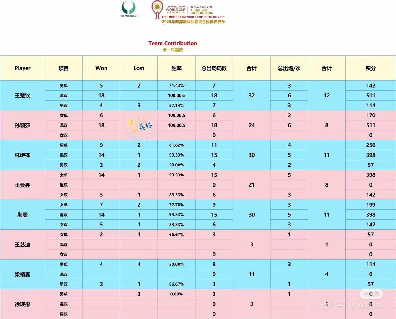 曼昱此次混团赛排名第三,说真的我很失望。 混团世界杯随着张本智和张本美和兄妹俩拱手送中国队5分,助力中国队夺冠取得三连冠佳绩完美落幕。 随即奖金分配和个人积分按照给团队贡献分配积分,曼昱此次世界杯比赛积分与蒯曼积分断崖式落后排名第三,孙颖莎排名第二,倘若看积分论成绩岂不是蒯曼实力最强? 蒯曼球技越来越好,实力越来越强有目共睹,但我看完比赛,她和孙颖莎,王曼昱相比之下有些不及莎莎和曼昱。 我觉得积分排名,还得看教练组安排。王曼昱混团世界杯比赛积分断崖式排名第三,我真的很失望,因为这关系到下届洛杉矶单打名额。 声明一下:这仅仅是本人看法,不代表网友看法。