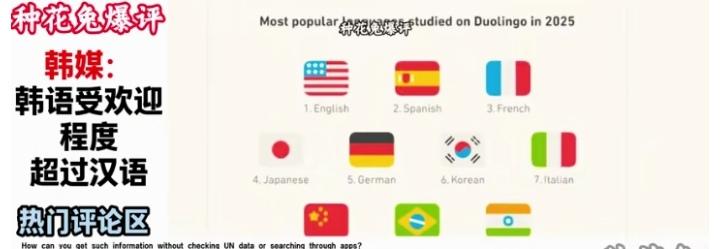 韩语全球受欢迎程度超汉语!韩媒又开始自娱自乐了,据韩媒从不知名APP 上统计,韩语受欢迎程度排名第6,汉语排名第8,在这份统计排名里,英语位列第一,其后分别是西班牙语,法语,日语,德语,韩语,意大利语,汉语,葡萄牙语,印地语…一般而言,语言流行程度,都是和母国国际影响力挂钩的,排名还是应以联合国公布为准!