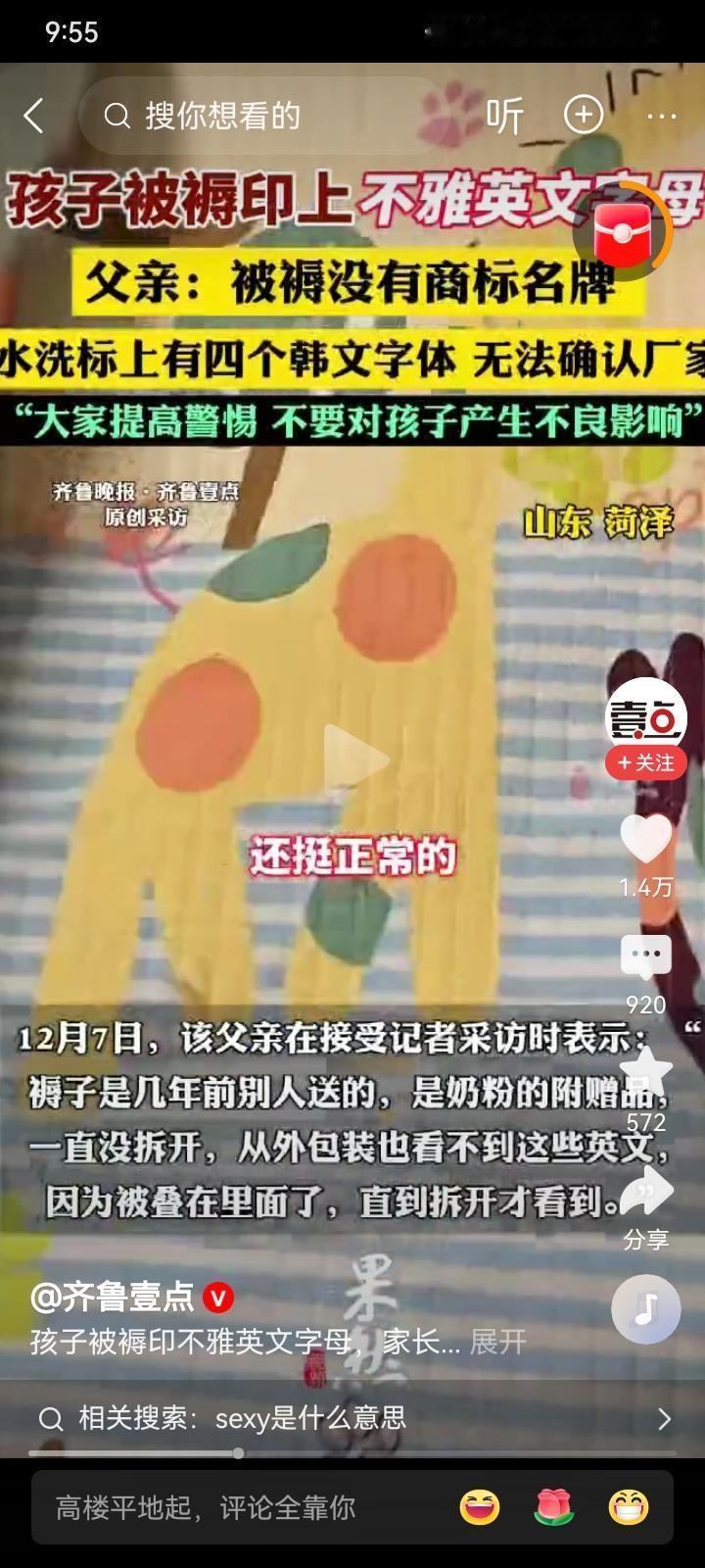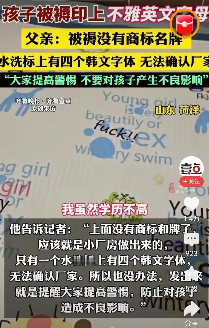“毒文化太可怕了!”山东菏泽,一父亲在孩子被子上发现一个可怕的事情。被子正面很正常,但没想到,打开里面一看,上面的字迹却让人气愤不已。 12月7日,在山东菏泽,一个父亲曝光出来一件让国人特别气愤的事情。 几年前,有人送给他家孩子几罐奶粉,而跟奶粉一起的,还有一个附赠品,是一个婴儿被褥。 当时是朋友送的,也没有多想,另外通过外包装也看不出来被褥有什么“不同寻常”的地方。 可万万没想到,近日,当他打开被褥时,眼前看到的一幕简直让他气愤不已。 首先是被子的第一面,印了一只卡通动物小鹿,旁边配了英文:I love family 。这个看着很正常,寓意也不错。 第二面印的是几个可爱的卡通小动物,也貌似没什么不正常。 可再打开,被子上印的英文字迹就让人难以接受了。这位父亲说:虽然我文化程度不高,但大体还是能看懂的!这毒文化真的是无孔不入,提醒大家一定要警惕,防止对孩子产生不良影响。 镜头扫过,可以看到那排英文字母是:young girl is very beautily or sex!更令人气愤的是,旁边还有一个大大的F开头,K结束的四字单词。 视频一出,网友们都炸锅了。有的说,毒文化真的是无孔不入,应该严查源头,把这个肮脏的东西赶出去。 但这个父亲也说了,看不清出厂牌子,应该是不知名的小公司印刷的。所以也无法追究责任。 也有的说,只要印的不是中国字,质量多好我都不会买。日文韩文的更不要。 不过,也有的网友说,young girl is very beautily or sex!意思就是:年轻女孩非常漂亮性感的意思,不要过度解读。 但这样的评论很快就被跟评的骂的不轻,sex就算可以解释的通,那f**k怎么解释!这个字眼是应该出现的吗?!更何况还是在宝宝的被褥上。 表面上是可爱的卡通图案,背地里却印着低俗甚至不堪入目的文字,这种东西对孩子的身心健康是一种潜在的伤害。 它潜移默化地影响着价值观,甚至让孩子在无意识中接受错误的观念。 所以作为家长,我们买东西不能只看外表,更要仔细检查内容,尤其是印在衣物、玩具、书籍上的文字图案。 而对这类低俗的文化,我们绝不能掉以轻心,要坚决抵制,要让孩子在干净、健康的环境中成长。 对此你们怎么看呢?