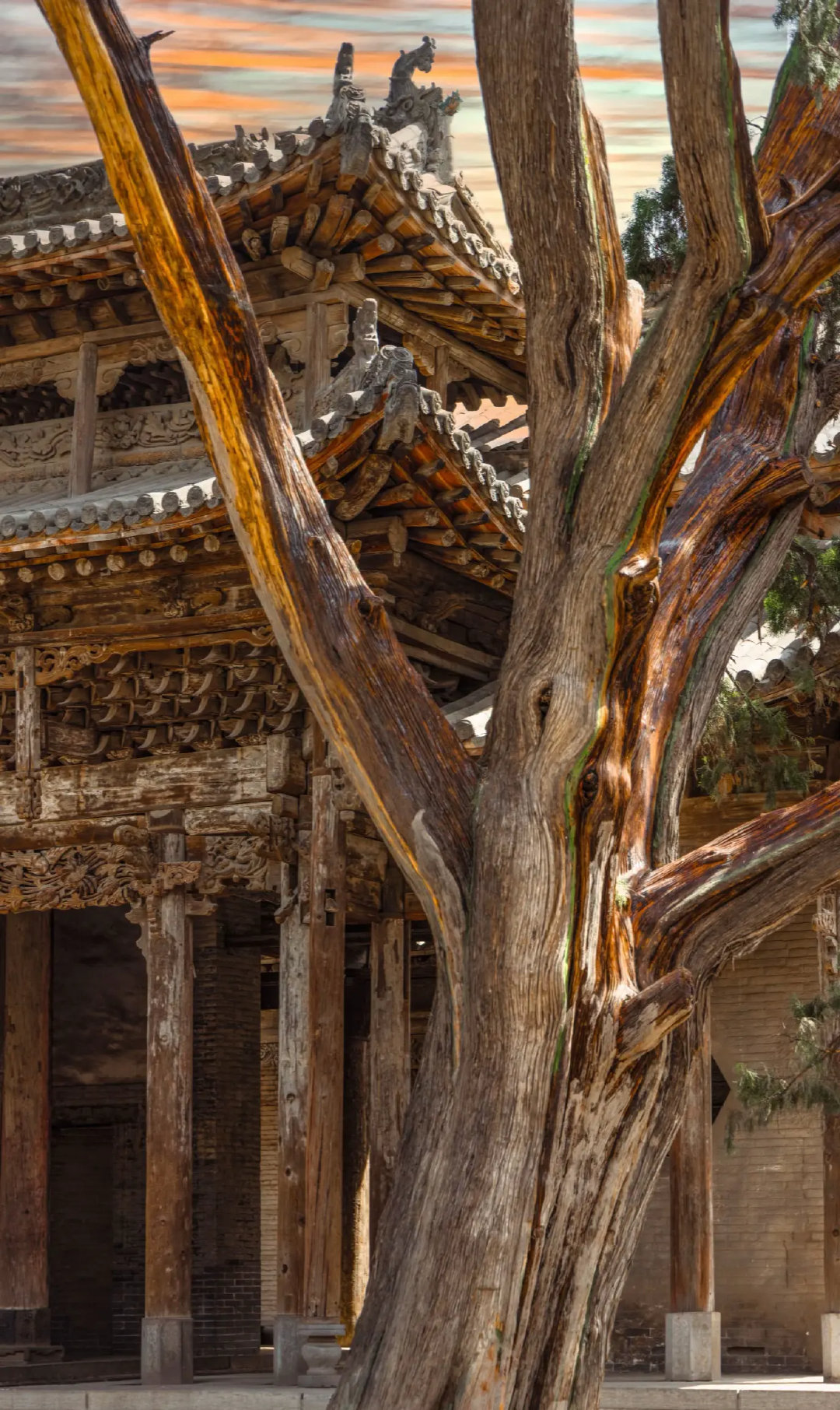 想把山西汾城这座冷门古城说给你听。穿过山门的刹那,像跌入时光褶皱——外界的纷扰被一道门槛隔绝,院内的宁静却沉甸甸地漫过来,像古柏投下的碎金,在午后阳光里把人轻轻裹住。明代香火与清代戏文,都被参天古柏收进年轮。它沉默地伸展枝桠,看岁月在屋檐下流淌,如今仍在午后阳光里洒下一地碎金。抬头时,目光会被藻井牵走。古戏台与献殿静静对望——戏台曾演尽悲欢离合,献殿总焚香顶礼,一动一静间,是俗与圣的和解,在时间里酿成了无声的诗。殿内墙上,上世纪的标语依稀可辨。当阳光斜斜穿过古柏,恰好照亮一半字迹,另一半隐在藻井阴影里——元明清的光阴,现代的印记,就这样被一束光串联,在同一处安静共存。这里没有解说词的喧嚣,只有古柏与戏台的静默相守。在汾城,我们不再是匆匆游客,更像个不打扰的客人,坐在千百年前的石阶上,看麻雀跳上屋脊,感受这份“层叠的宁静”——它比纯粹的古老更动人,是山西慷慨赠予的慢时光。