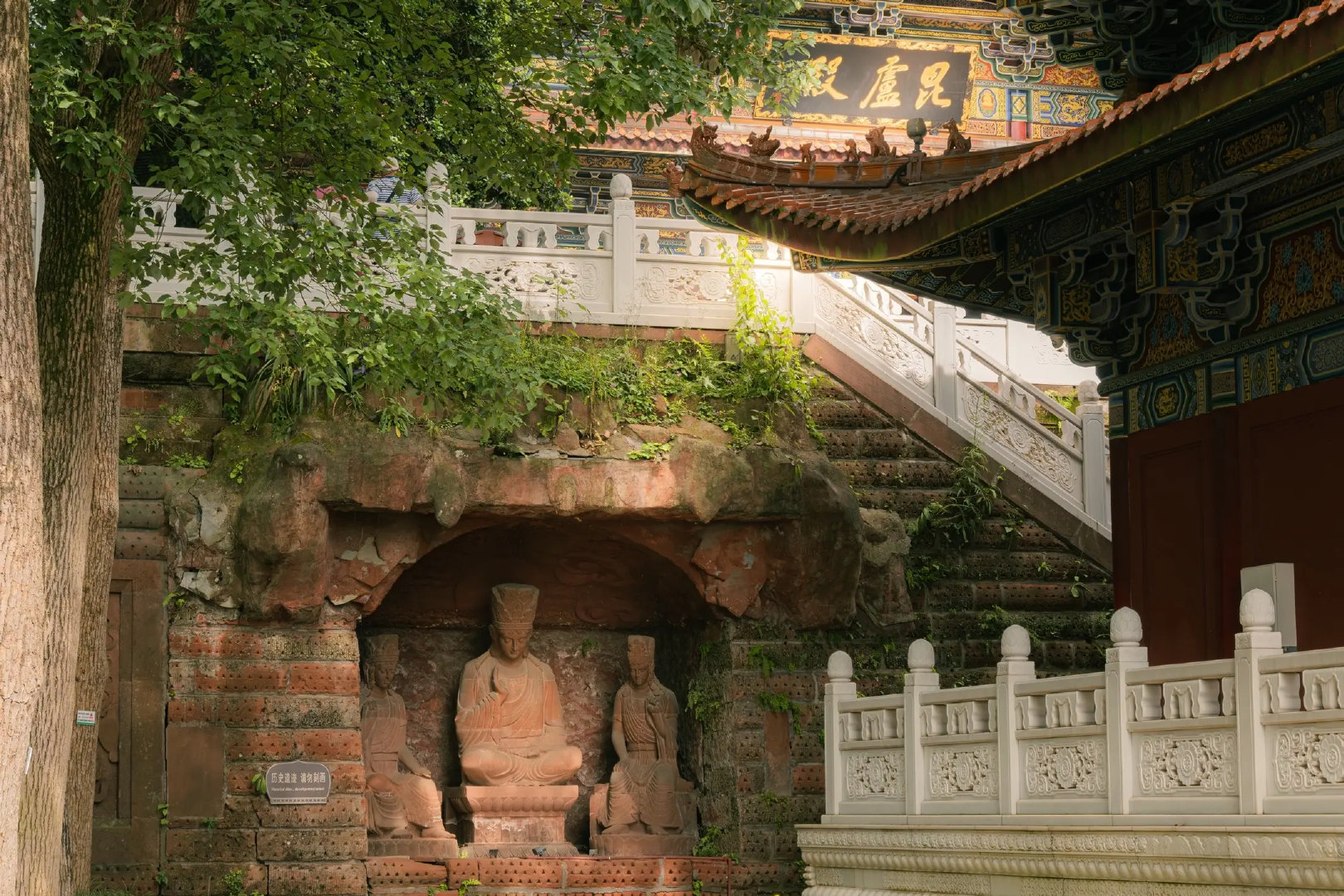 乐山大佛背靠的凌云山藏着许多古寺,檐角风铃与雕梁木语在山风中交错,佛像庄严静立,
