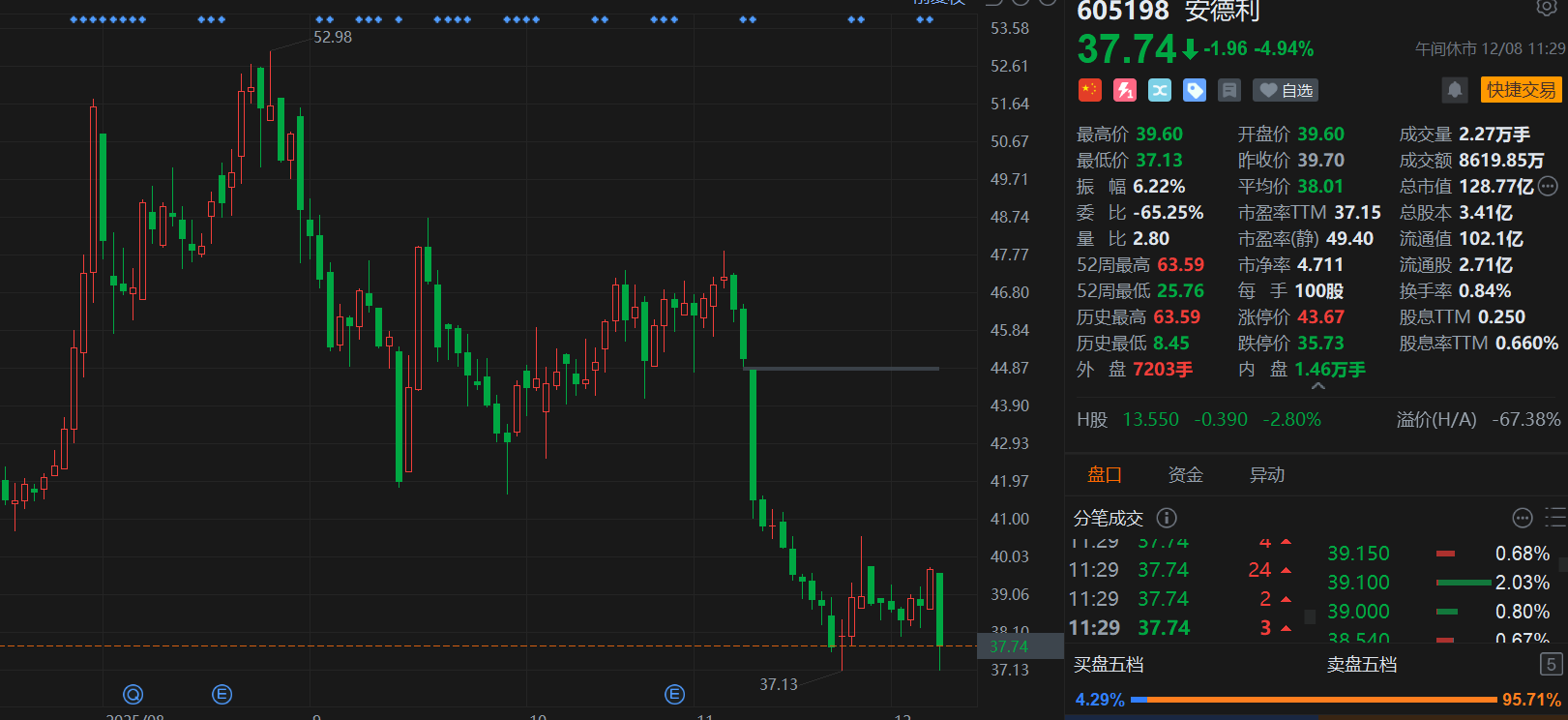 安德利(605198.SH)午间收跌5%,盘中跌至6.5%,现报37.74元,总市值128.8亿元。消息上,安德利上周五盘后发布股份减持公告,股东广州统一企业有限公司拟减持公司股份不超过341.2万股,减持比例不超过公司总股本的1%。此外据悉,该公司近三年累计发布减持计划公告3次。需要注意的是,公告中披露拟减持股份数量不代表最终实际减持股份数。