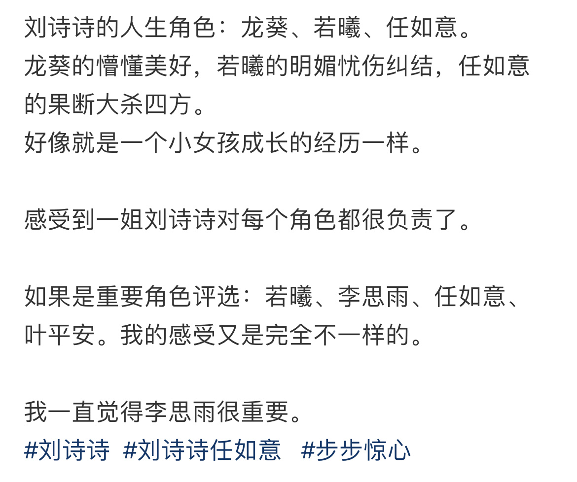 网友:刘诗诗人生角色三阶段:龙葵,若曦,任如意重要角色:若曦,李思雨,任如意,叶平安。我觉得重要角色还得➕蒋南孙,燕三娘,拓跋玉儿,谭允贤吧