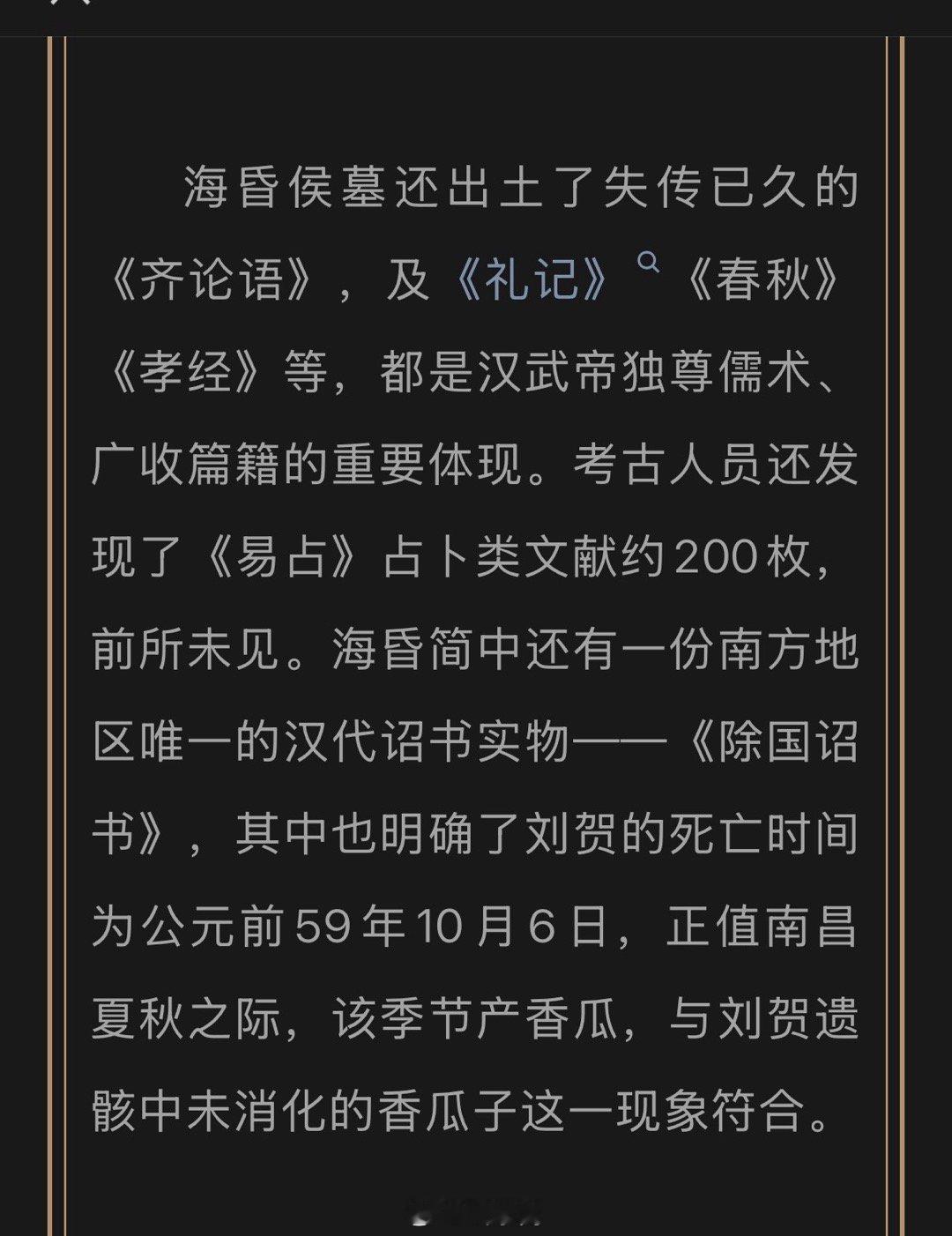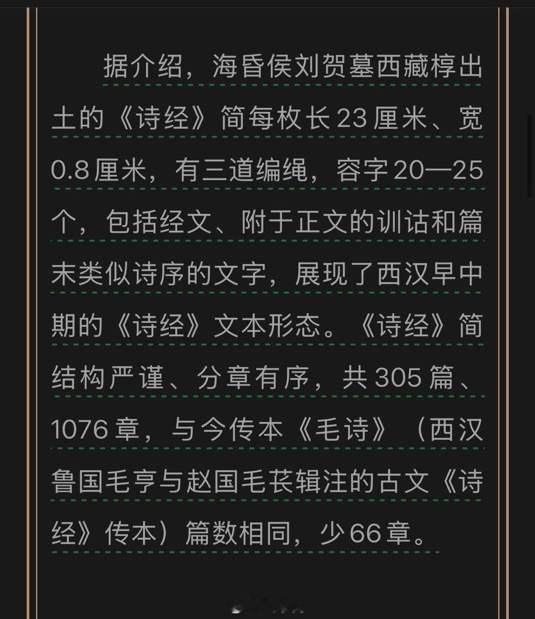 海昏侯墓出土《诗经》文本,有了一个初步的信息。读报道,我们能获得什么有用的信息?1,简长23公分,是一尺简,不是大经的二尺四寸简,说明这是经常讽诵阅读的文本,如同《论语》《孝经》。2,简文除正文、附于正文的训诂外、篇末有诗序,此与今传《毛诗》形式大致相同,可见是五经博士系统下经典文本的基本面目。《诗序》是毛诗独有,还是三家诗皆有?有学者据《毛诗》二十九卷,认为多出来的一卷是《诗序》,毛诗独有。3,有的报道说,海昏侯墓《诗经》的排序是,风,大雅、小雅,三颂,与《毛诗》先小雅后大雅,不同。如果是先大雅后小雅,则更接近颂雅风的排序。与《诗论》相同,此处存疑?4,海昏侯《诗经》章句与《毛诗》不同,少了六十六章,大概是因为今本《毛诗》章句经过郑玄修改,齐鲁韩三家诗经皆二十八卷,可见章句大致相同。5,海昏侯的太傅王式,本为《鲁诗》后学,所传刘贺的诗经应为《鲁诗》。汉武帝的师父赵、王二人,是鲁申公弟子,也是《鲁诗》后学,故而汉代宫廷《诗经》的文本和家法,应当是源自荀子的《鲁诗》学,楚元王刘交的《元王诗》也与《鲁诗》同源。6,根据《汉志》,申公曾为《鲁诗》作「训故」,有《鲁故》二十五卷,不知是否即是此次出土文本后面的训诂,如果出土的是《鲁故》,那将是千年以来经学的最大发现。。。。
