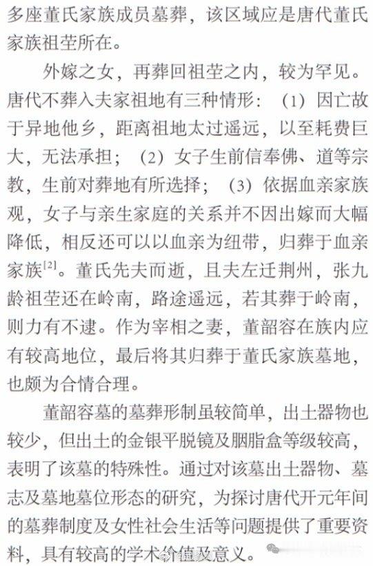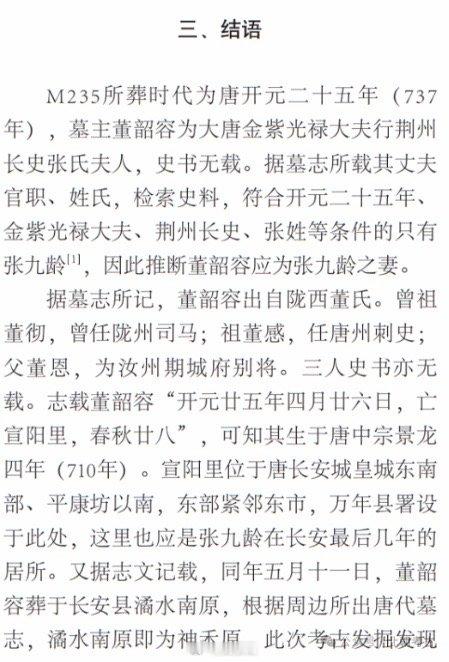 2022年5月,陕西考古研究院在西安市长安区贾里村安置小区项目用地发现一处唐代董氏家族墓地。其中M235墓葬出土有墓志,墓主为张府君夫人董韶容,一般认为此墓主人是宰相张九龄的夫人。读墓志,需要读懂其中的典故,《简报》的结论比较简单,没有深入,也没有说清很多有价值的问题。举例如下,《墓志》云「叨椒掖之亲」,知董氏后宫贵人(椒房、掖庭)亲属,其必为唐玄宗董贵妃的族人。《墓志》云:「承纶言之聘」,纶言,典出《礼记》,知董氏嫁张某,是圣旨撮合的婚配。《墓志》云:「一嫔丞相,七载妇仪」,知其约于开元十八年前后适张某,而此时张某恰在外放,至开元十九年初乃召回,擢秘书少监,兼集贤院学士,随即知制诰、中书侍郎。故而,董氏适张某应在开元十九年,七年实则是数首尾而言。张九龄为玄宗倚重,又内依椒房之亲,故不久于开元廿一年拜相。这才是从《墓志》中获得了更多的历史文献不具备的知识信息。。。