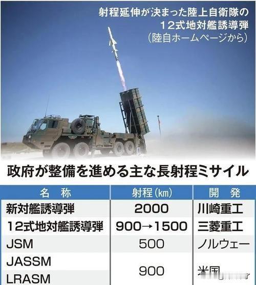 日本“12式改进型”远程巡航导弹(能力向上型12式反舰导弹)日本导弹 1. 基础定位与类型:亚音速远程巡航导弹,是日本国产中远程巡航导弹技术核心项目,旨在构建陆海空通用打击体系,具备反舰和对地攻击双重能力(早期型号射程约200公里,改进型分阶段大幅提升)。 2. 尺寸与重量:总长接近9米,弹体直径近1米,最大翼展接近4米;战斗部为半穿甲类型,重量约160-225千克。 3. 飞行性能:最大速度约0.9马赫(亚音速),最大射程超1000公里(不同资料表述略有差异,部分提及900-1000公里);可实现低空突防,海平面飞行高度约10米,陆地飞行高度约50米。 4. 动力与隐身设计:搭载小型涡扇发动机(推测为川崎KJ300涡扇发动机,推力365公斤),配合固体火箭助推器提升燃料效率与射程;采用多面体隐身修形、腹部进气道、折叠弹翼设计,表面喷涂吸波涂料,雷达反射截面(RCS)约0.01-0.1㎡,降低被探测拦截概率。 5. 制导与控制:采用“惯性导航+GPS+地形匹配+末端主动雷达”复合制导模式,末端为Ka波段有源相控阵雷达(AESA),抗干扰能力和命中精度突出;配备双向数据链,支持飞行中目标信息更新与动态修正,实现“人在回路”控制。 6. 发射平台与任务:适配多平台发射,包括陆基轮式发射车、舰载MK41垂直发射单元、空基F-15J战斗机及P-1巡逻机;可通过更换导引头模块,打击水面舰艇、港口、机场等陆海目标。 7. 部署计划:日本自卫队计划自2025财年起部署超1000枚,优先配备西南诸岛(如冲绳)和九州地区,2026年起逐步换装7个岸舰导弹联队。
