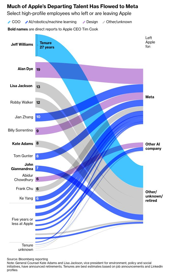 苹果公司高管离职潮:苹果(AAPL)正经历数十年来最大的人事动荡,数位高层主管及