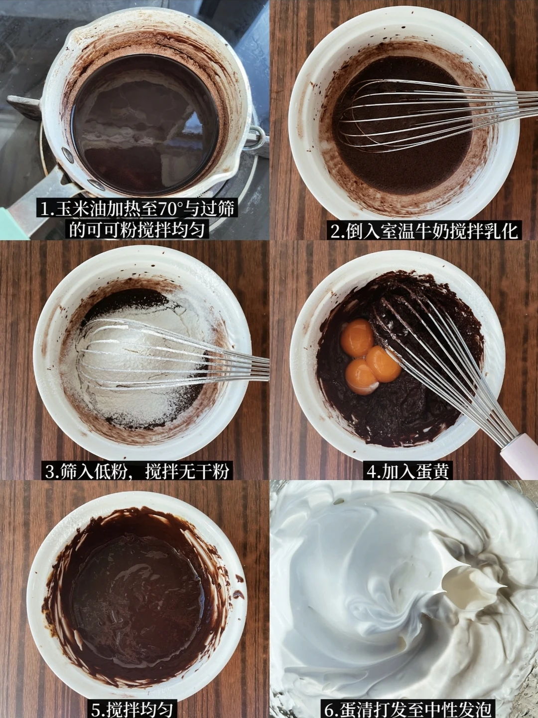 1️⃣ 加热玉米油至70度,倒入提前过筛的可可粉,快速搅拌溶化,倒入室温牛奶,搅拌乳化,没有一点油星为止