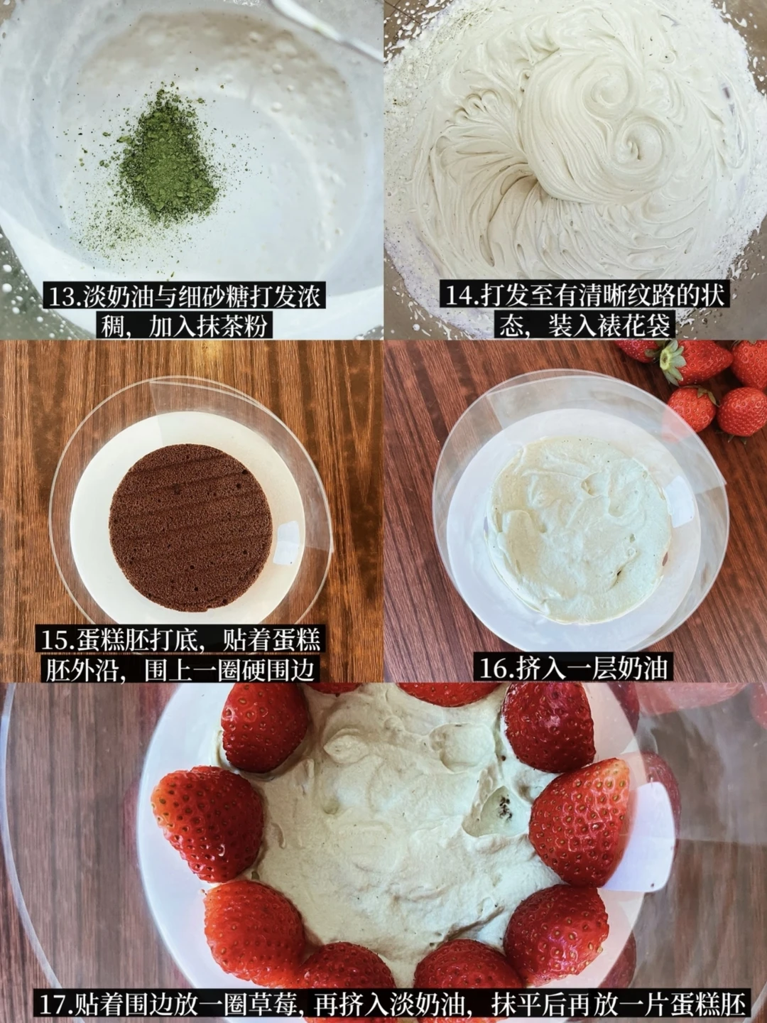 6️⃣蛋糕胚外面围上一圈围边,挤入一圈抹茶奶油,贴着围边放一圈草莓。挤入抹茶奶油抹平表面,再放一片可可蛋糕胚。抹上抹茶奶油,顶部用草莓装饰
