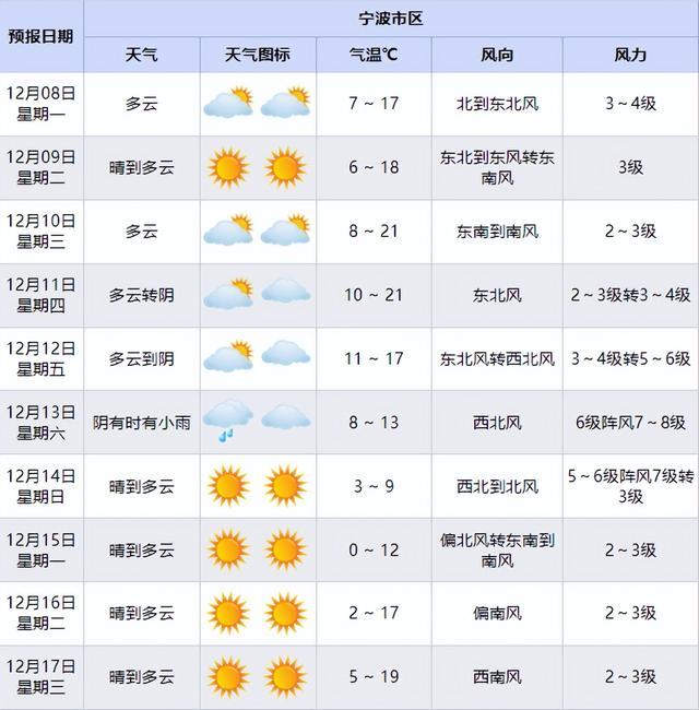 需要关注的是,一股“实力不俗”的冷空气将在13日前后影响宁波,受其影响有一次大风、降温和弱降水天气过程,届时气温将下降至个位数,最低气温更将下跌“冰点”附近,14日到16日最低气温降至0℃~3℃,山区-2℃~-5℃。请大家及时关注最新的天气预报信息。