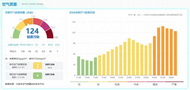 天气静稳,空气质量却不佳,据宁波市空气质量实时发布平台10时发布的数据显示,宁波AQI指数为124,轻度污染。大家出门做好防护措施,戴上口罩,室内可以打开空气净化器。