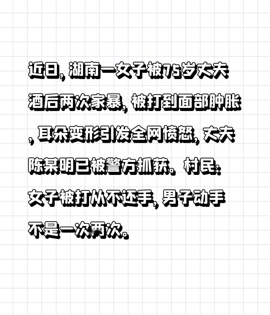 近日,湖南有位女子可真是倒了大霉,被75岁的丈夫酒后家暴了两次,那场面,就跟被拳击手狠狠揍了一顿似的,打得面部肿胀,耳朵都变形了,这事儿一曝光,瞬间在网上炸开了锅,网友们的愤怒就像火山喷发一样。目前,丈夫陈某明已经被警方给“请”进去了。有村民透露,这女子被打时就跟个小绵羊似的,从不还手,而那男子动手打人,那可就跟家常便饭一样,不是一次两次了。家暴