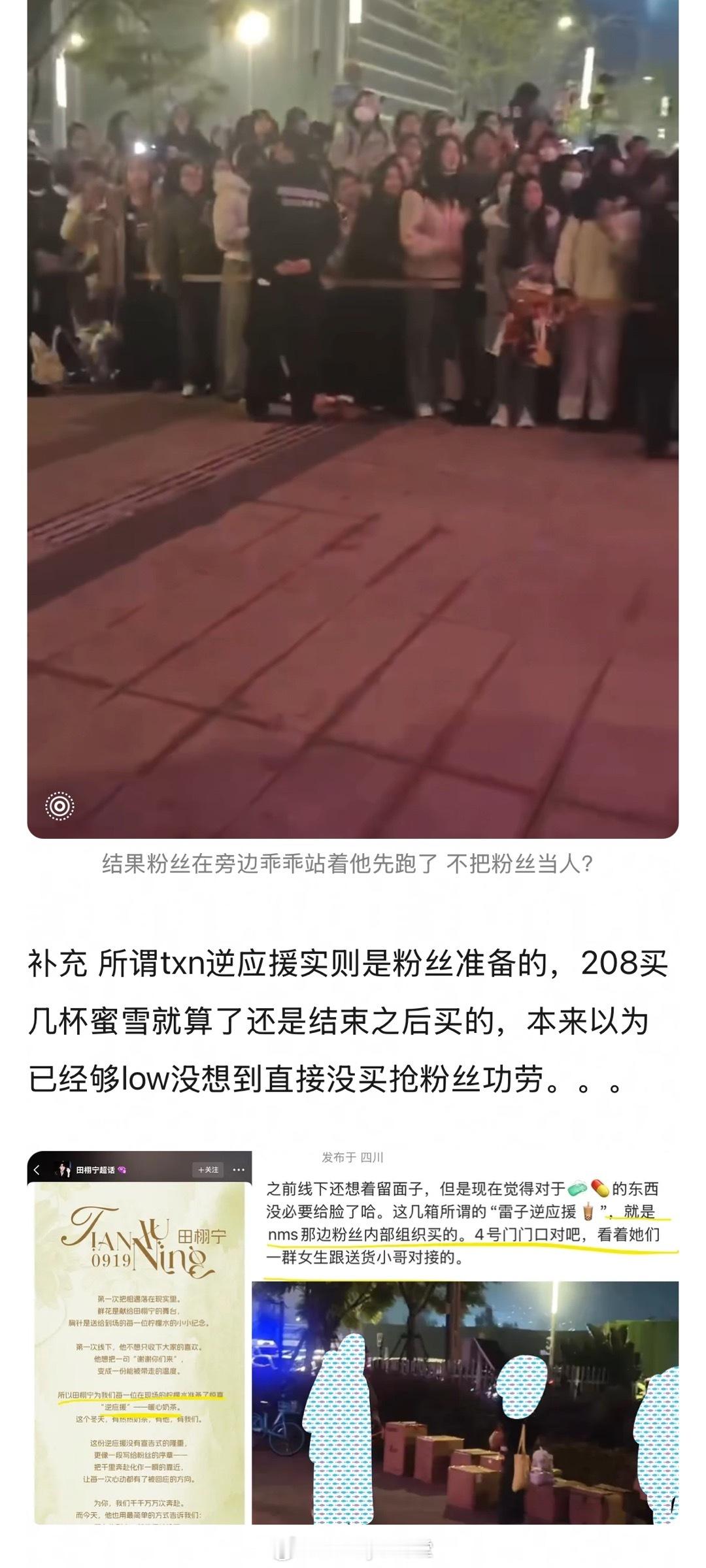 田栩宁经纪人训话现场粉丝,说待着不动,田栩宁的车就会来打招呼,如果要闹,田栩宁就会从别的出口离开,结果田栩宁先走了……
