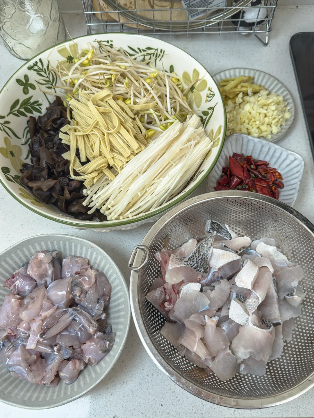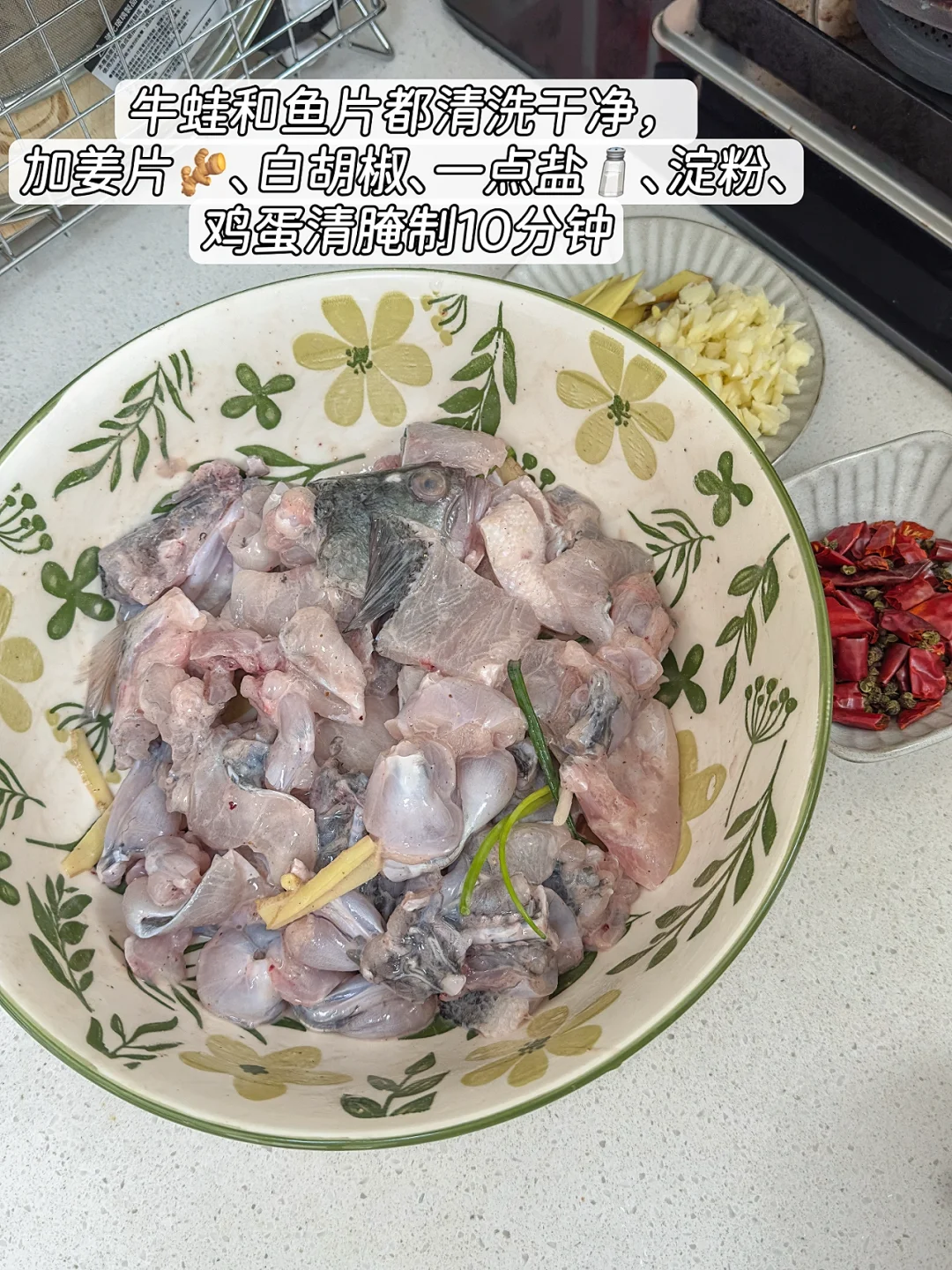 一大早上的就起来买菜🥬,我真的是勤快到不行啊🌞~~ 好久没吃美蛙鱼了,想得不行 今天必须来一个 食材: 蛙、鱼、豆芽🌱、金针菇🍄、千张(你喜欢的所有配菜)、大蒜、葱花、香菜 做法: 1、牛蛙和鱼片都清洗干净,加姜片🫚、白胡椒、一点盐🧂、淀粉、鸡蛋清腌制10分钟 2、 黄豆芽、木耳、金针菇等所有配菜焯水备用♨️ 3、锅中加多点油,放入姜片、大蒜🧄炒香,加入美蛙鱼料包出红油 4、加适量清水或高汤,烧开后加入牛蛙煮3-4分钟⏳,再加入鱼片轻轻拨散,煮至变色即可,(不要久煮❗) 5、把焯好的配菜铺底🧺,牛蛙和鱼片盛在配菜上,小锅里重新热少许油,放入干辣椒和花椒,热油泼在成品表面,香味扑鼻❗🫕💨 完成✅!!