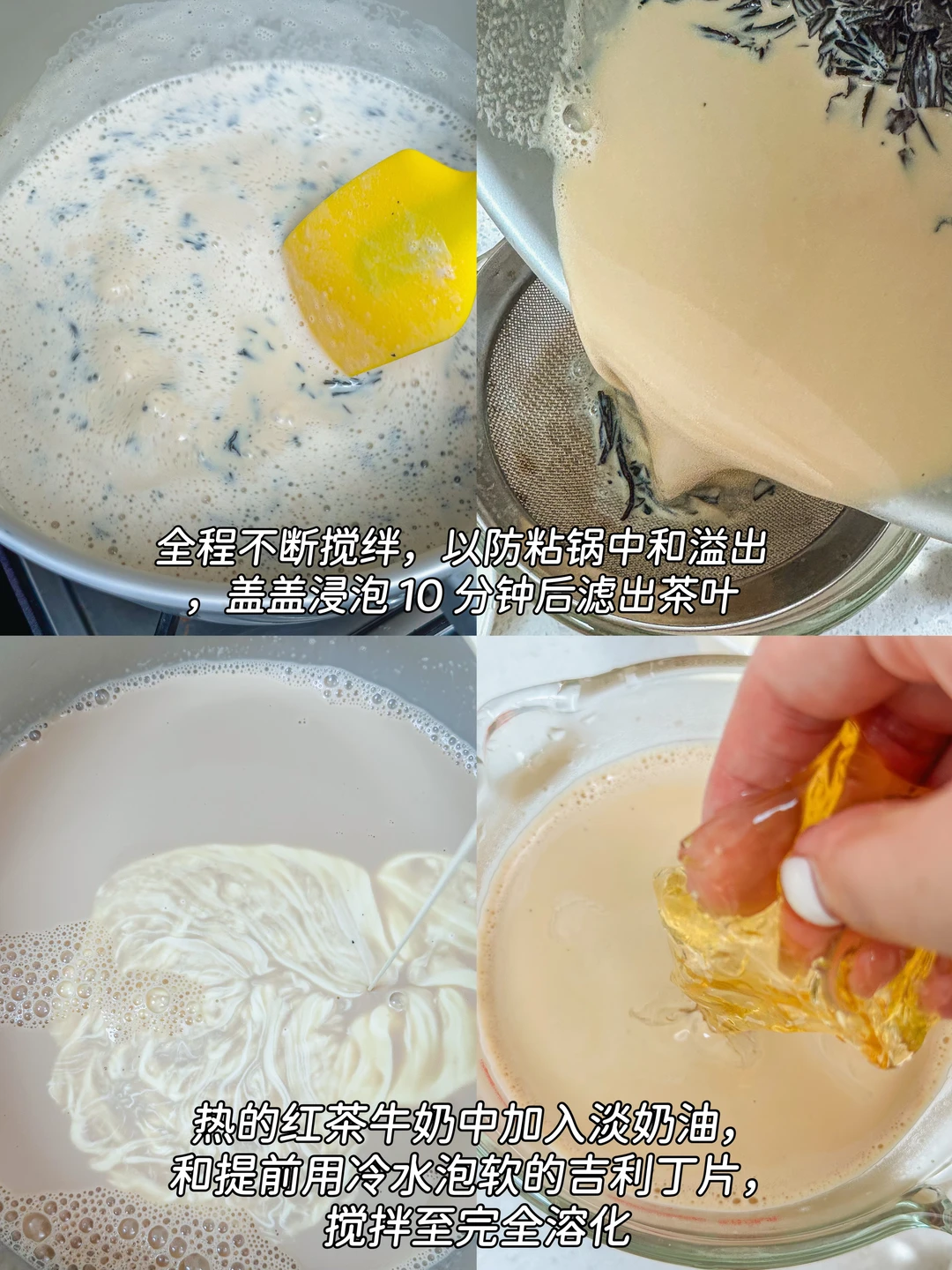 2️⃣温热的红茶牛奶中加入淡奶油(口感更顺滑)和提前用冷水泡软的吉利丁片,搅拌至完全溶化