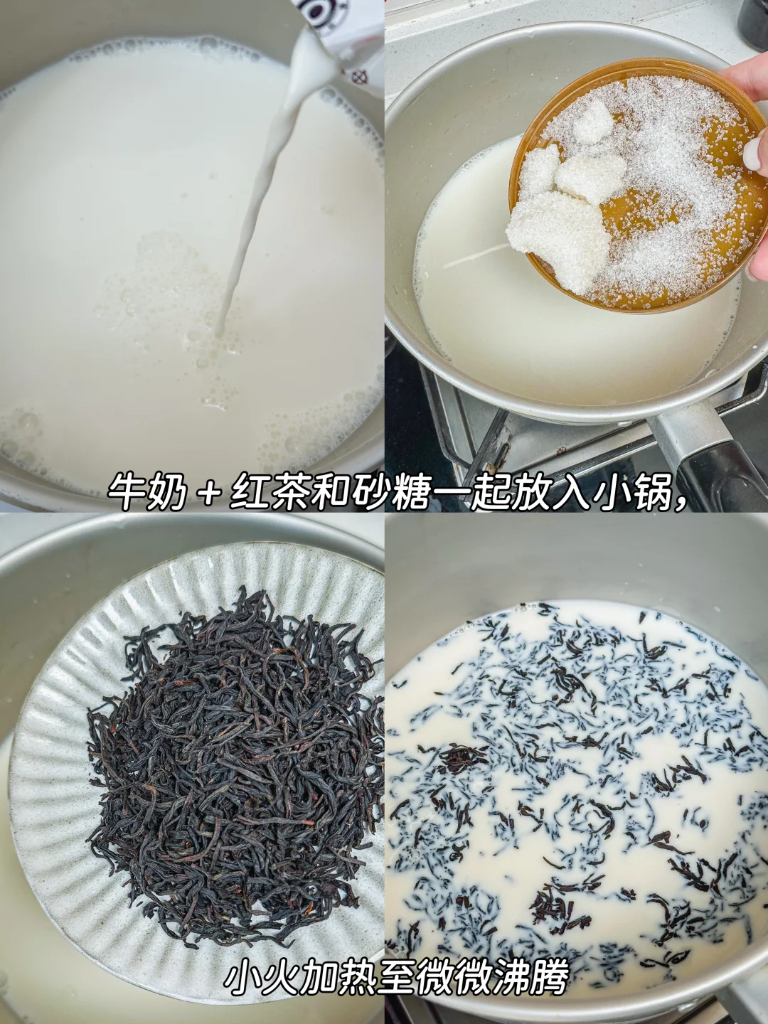 1️⃣牛奶 + 红茶和砂糖一起放入小锅,小火加热至微微沸腾(全程不断搅绊,以防粘锅中和溢出),盖盖浸泡 10 分钟后滤出茶叶☕,这个时候整个牛奶都变成淡淡的茶色,带着清香~🌸