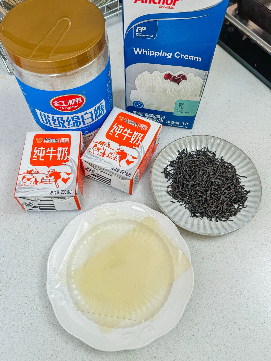 红茶包 2个(或散装红茶 13g 左右)、牛奶 500ml🥛、淡奶油 125ml、细砂糖 35g🍬、吉利丁片 10g