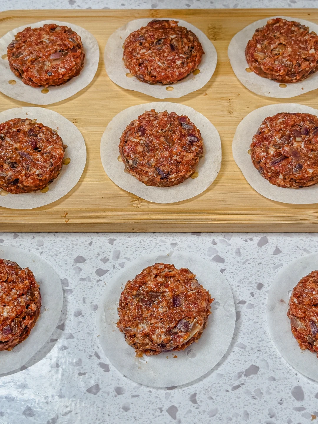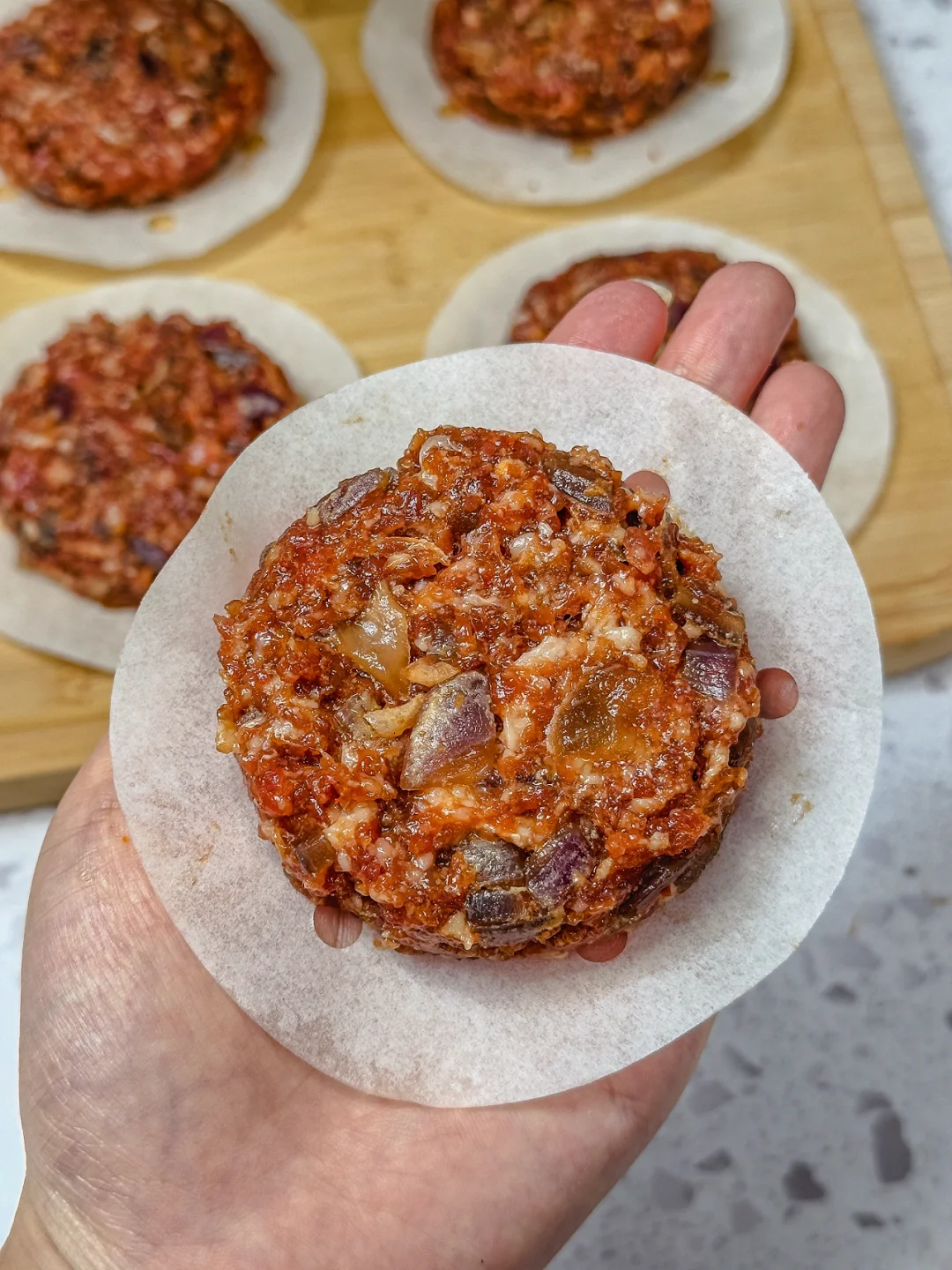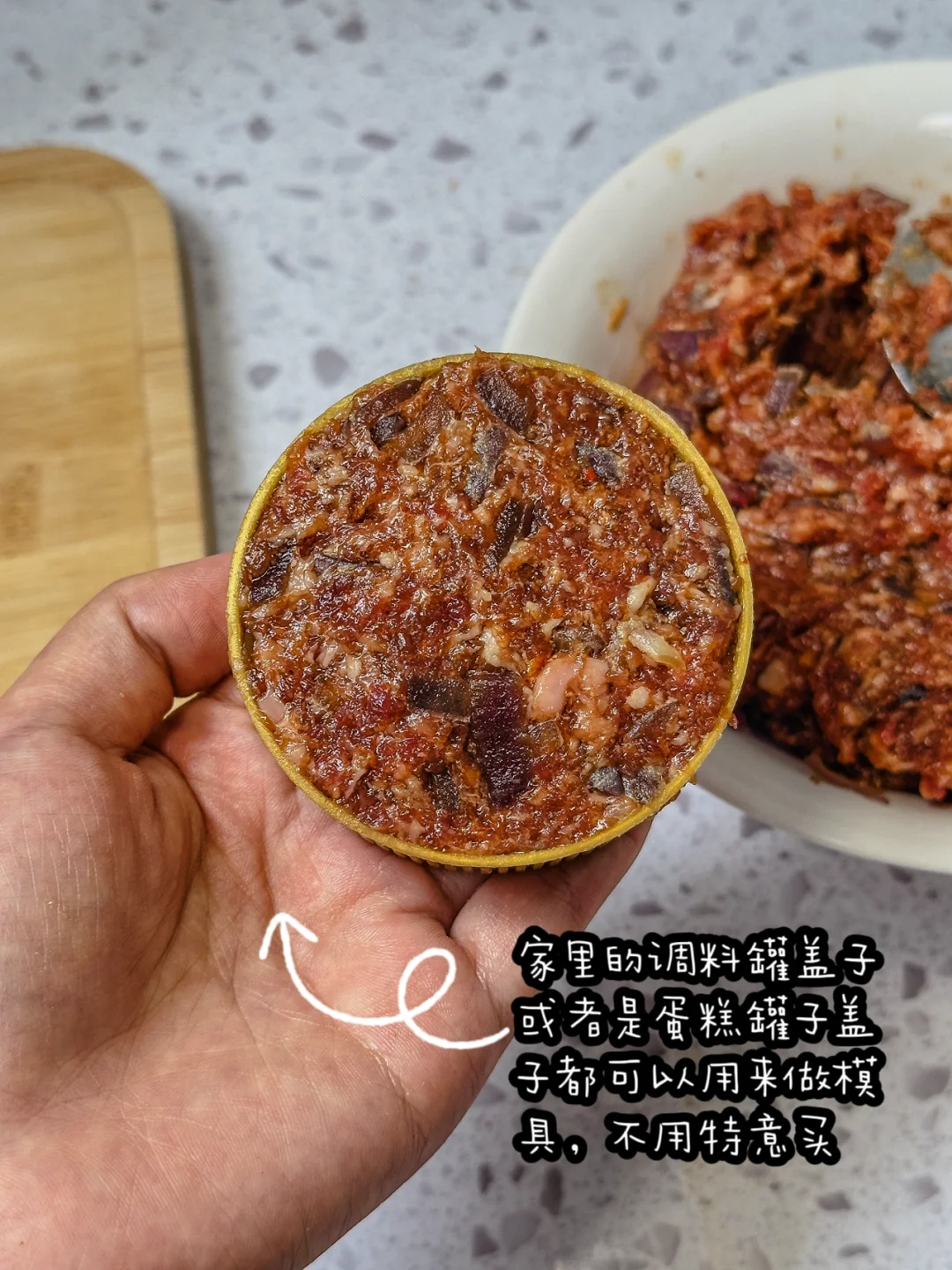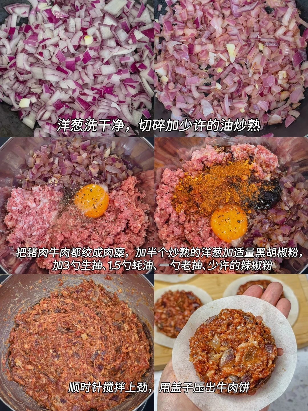 不用特意买模具,在家也能做出超好吃的牛肉饼~ 用来夹馒头和汉堡🍔都太合适了,毕竟这是优质蛋白质 做法又简单,比山姆的好吃还划算,而且没有任何科技与狠活 🥗 追求干净饮食和减脂期的宝宝都可以多备一点,健康又顶饱~ 📋 食材: 牛肉 400g 猪肉 200g 🐖 洋葱 半个 🧅 黑胡椒粉 少许 鸡蛋 1 个 🥚 生抽 3 勺 蚝油 1.5 勺 🦪 老抽 1 勺 、少许不辣的辣椒粉(用来上色的,没有也可以不加) 👩‍🍳做法: 1️⃣牛肉、猪肉都搅成肉糜,洋葱切碎,用少许油炒熟 🍳 2️⃣把所有的配料一一放入,顺时针搅拌上劲 🔄 3️⃣拿一个家里不用的罐子盖,按出一个个牛肉饼 4️⃣用烘焙纸一个个隔开,再用保鲜袋装好,放冰箱冷冻 💡 想吃的时候直接拿出来煎!一口爆汁!超满足~🔥🤤