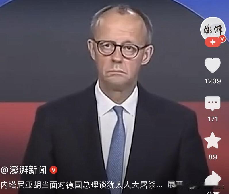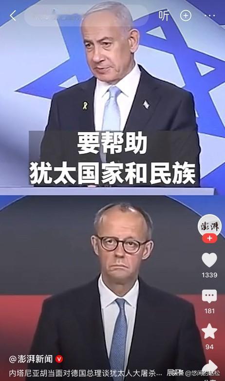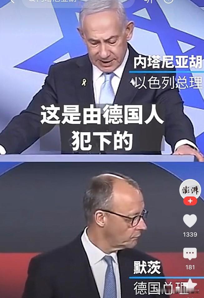 默茨主动来以色列修补关系,没想到内塔尼亚胡当面提犹太人大屠杀的事,悲剧是德国造成的,德国要对我们负责任! 默茨看着内塔尼亚胡,你别当着这么多人说了,内塔尼亚胡不理默茨还继续说,默茨只好撇着嘴,我们会负责到底的!
